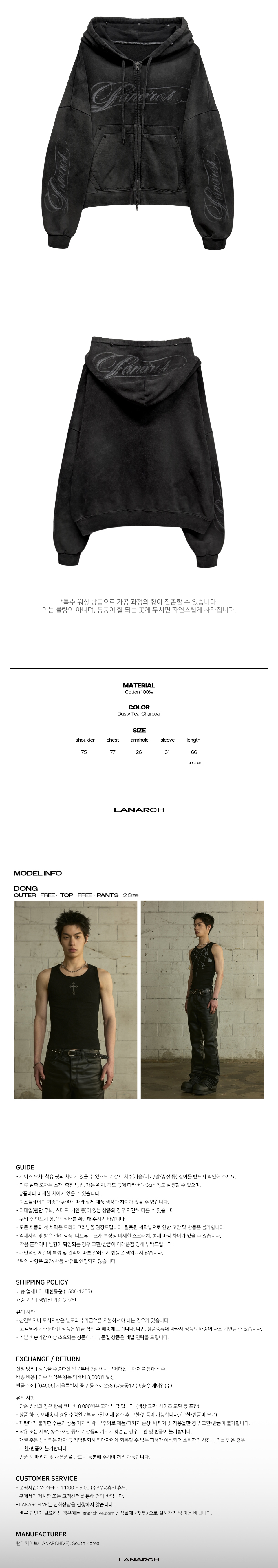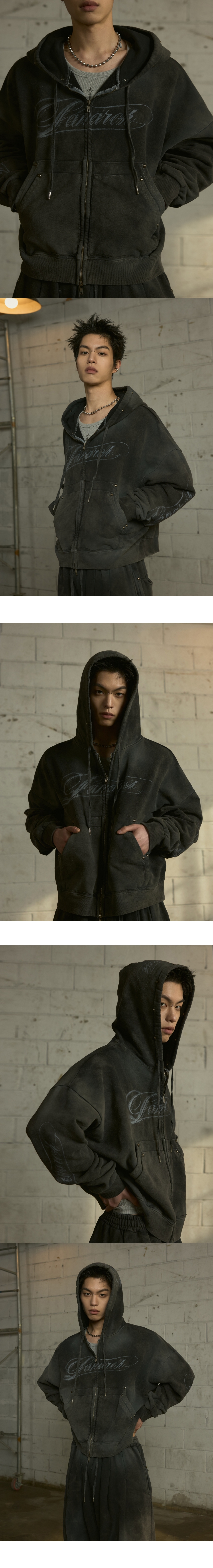 랜 아카이브 0112 빈티지 워시드 스터드 로고 집업 후디 - 차콜