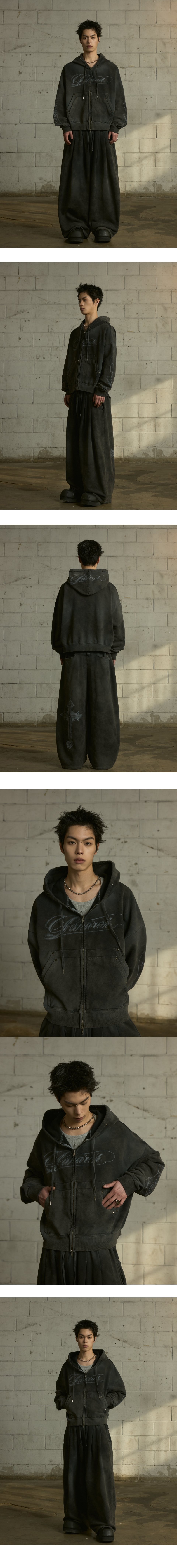 LAN ARCHIVE 0112 Vintage Washed Stud Logo Zip-up Hoodie - Charcoal