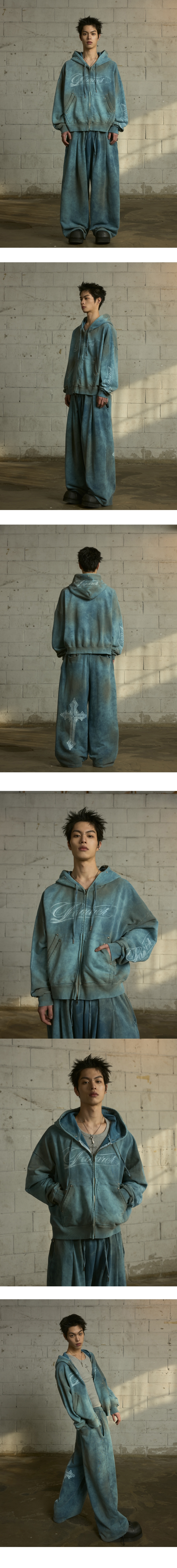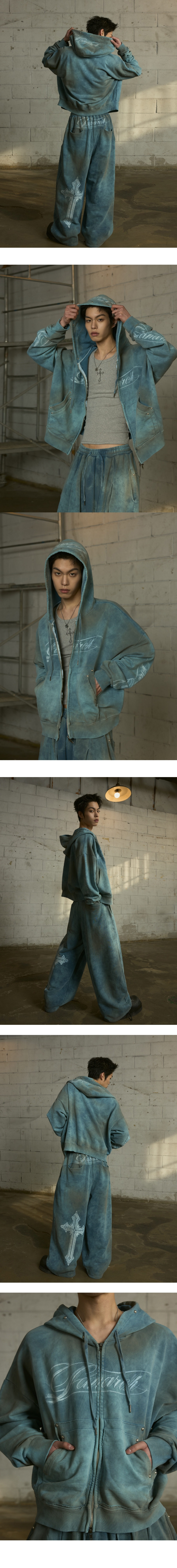 LAN ARCHIVE 0112 Vintage Washed Stud Logo Zip-up Hoodie - Dusty Teal