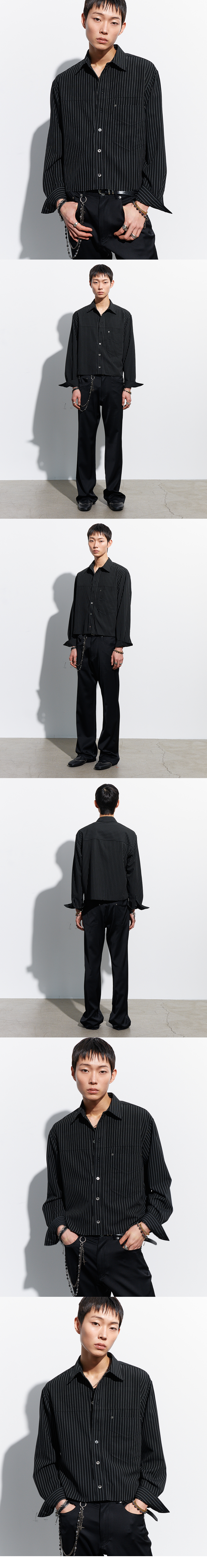 스트라이프 소재로 제작된 레귤러한 실루엣의 크롭 셔츠입니다. 컷-오프 처리된 밑단과 리벳 처리한 오버사이즈의 가슴 포켓이 특징으로 캐주얼하면서도 트렌디한 무드를 연출합니다. -DETAIL- 크롭 핏 플랩 포켓 형태를 가진 패치 포켓 컷-오프 처리된 밑단 *밑단의 경우 자연스럽게 올이 풀리며 하단의 봉제선 이상은 풀리지 않습니다* 천연 자개 단추 MADE IN KOREA
