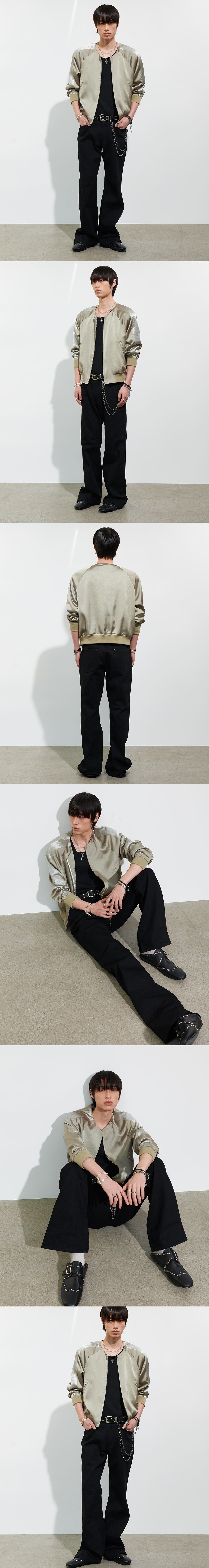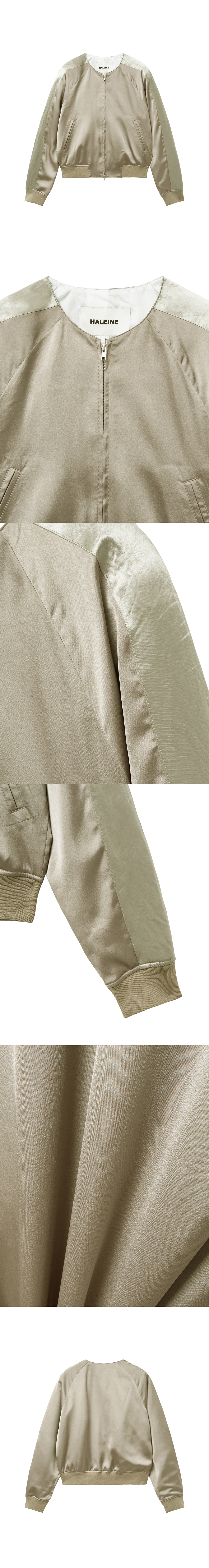 은은한 광택이 감도는 몸판과 결이 다른 패널을 조합해 제작한 수베니어 자켓입니다. 칼라를 배제한 구조로 넥 라인을 간결하게 정리해 전체 실루엣을 더욱 미니멀하게 완성했습니다. 서로 다른 표면감이 자연스럽게 대비를 이루며 절제된 포인트를 더합니다. 래글런 숄더 내장 패드 삽입으로 어깨를 보강하여 균형 있는 비율을 완성합니다. 가볍게 걸쳐도 형태가 무너지지 않는 균형 잡힌 실루엣이 특징입니다. -DETAIL- 몸판과 패널 소재 대비 구성 칼라리스 디자인 어깨 패드 내장 프런트 지퍼 여밈 사이드 웰트 포켓 립 조직 밑단 및 소맷단 MADE IN KOREA