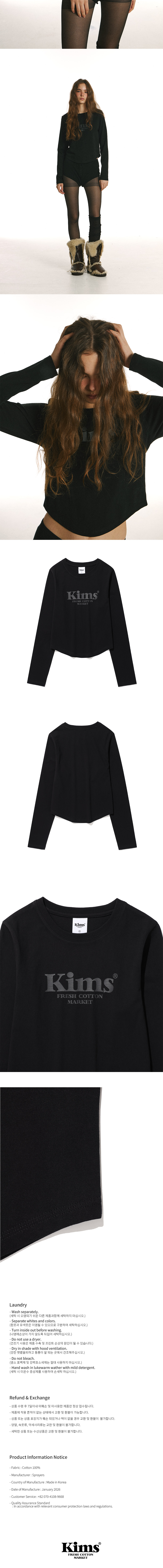킴스프레시코튼마켓의 스테디셀러 로고가 담긴 해당 제품은 베이직한 긴팔 티셔츠에 브랜드만의 감각적인 실루엣을 더한 아이템입니다. 일상 속에서 가장 편안하면서도 스타일리시하게 즐길 수 있는 에센셜 피스입니다. 적당한 두께감의 20수 싱글 원단에 바이오 워싱 처리를 더해, 피부에 닿는 순간 느껴지는 극강의 부드러움과 쾌적한 착용감을 선사합니다. 고품질 원단 사용으로 잦은 세탁에도 변형이 적으며, 오랜 시간 깨끗한 아웃핏을 유지합니다. 밑단을 완만한 라운드 형태(Round Hem)로 설계하여, 착용 시 허리 라인이 한층 더 잘록해 보이는 시각적 효과와 함께 다리가 길어 보이는 실루엣을 완성합니다.