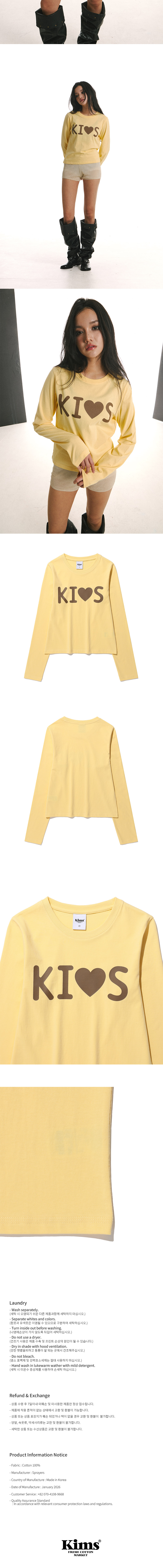 킴스프레시코튼마켓 플랫 키스 로고 롱슬리브 긴팔티셔츠 옐로우