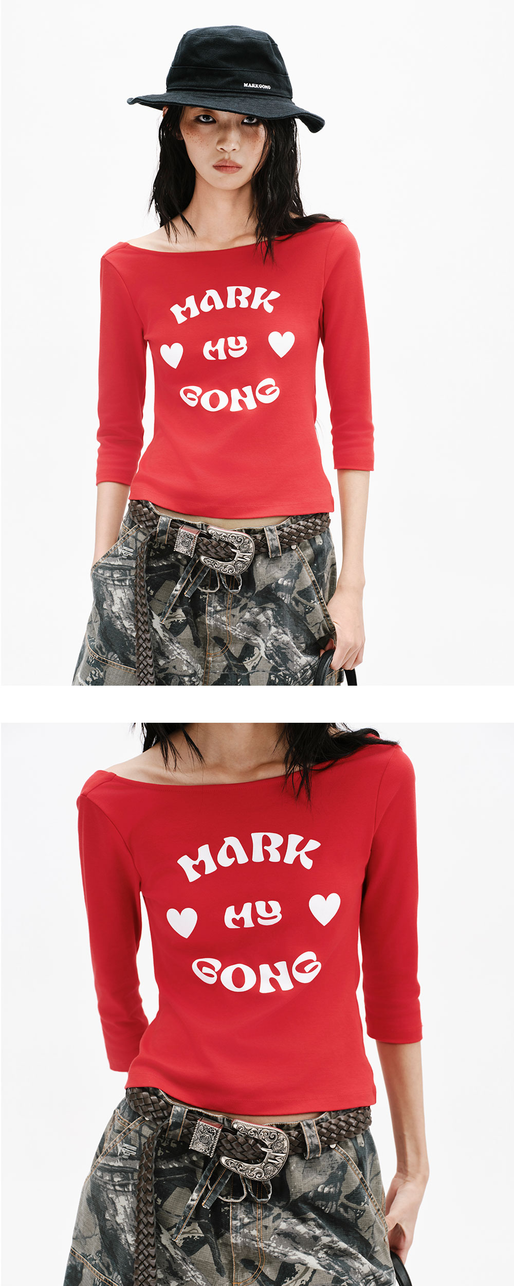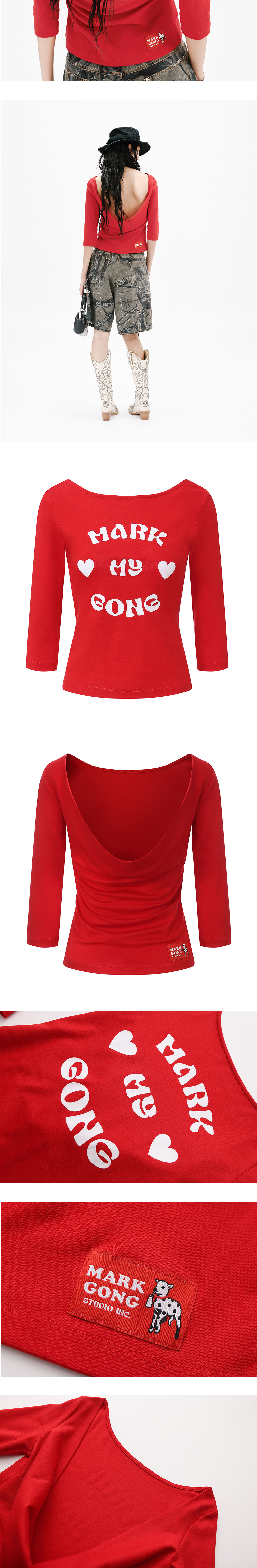 마크공 우먼 마크 마이 공 프린티드 레드 3/4 슬리브 카울 넥 백리스 탑 레드 입니다. - 키치한 레드 하트 & 레터링 그래픽 - 백리스 반전 카울 넥 & 뒤트임 디자인 - 슬림 7부 소매로 Y2K 실루엣 완성 - 신축성 좋은 소재 편안하고 밀착되는 착용감