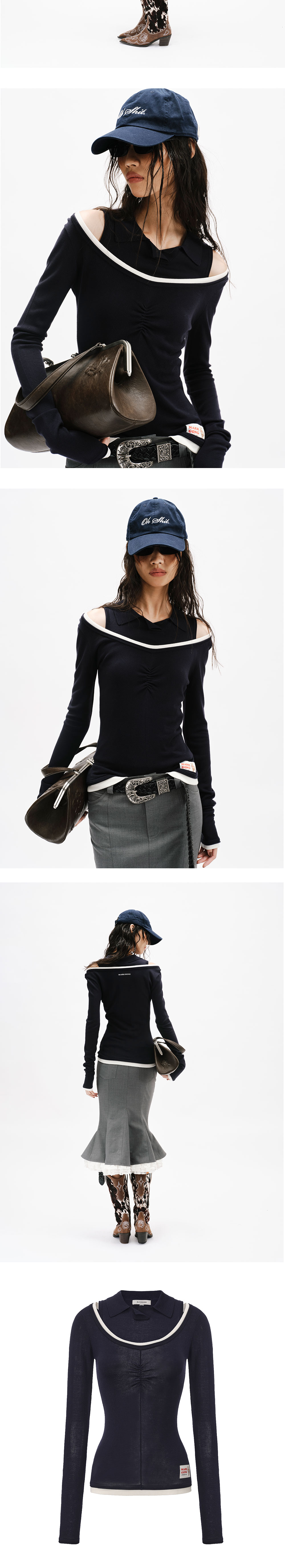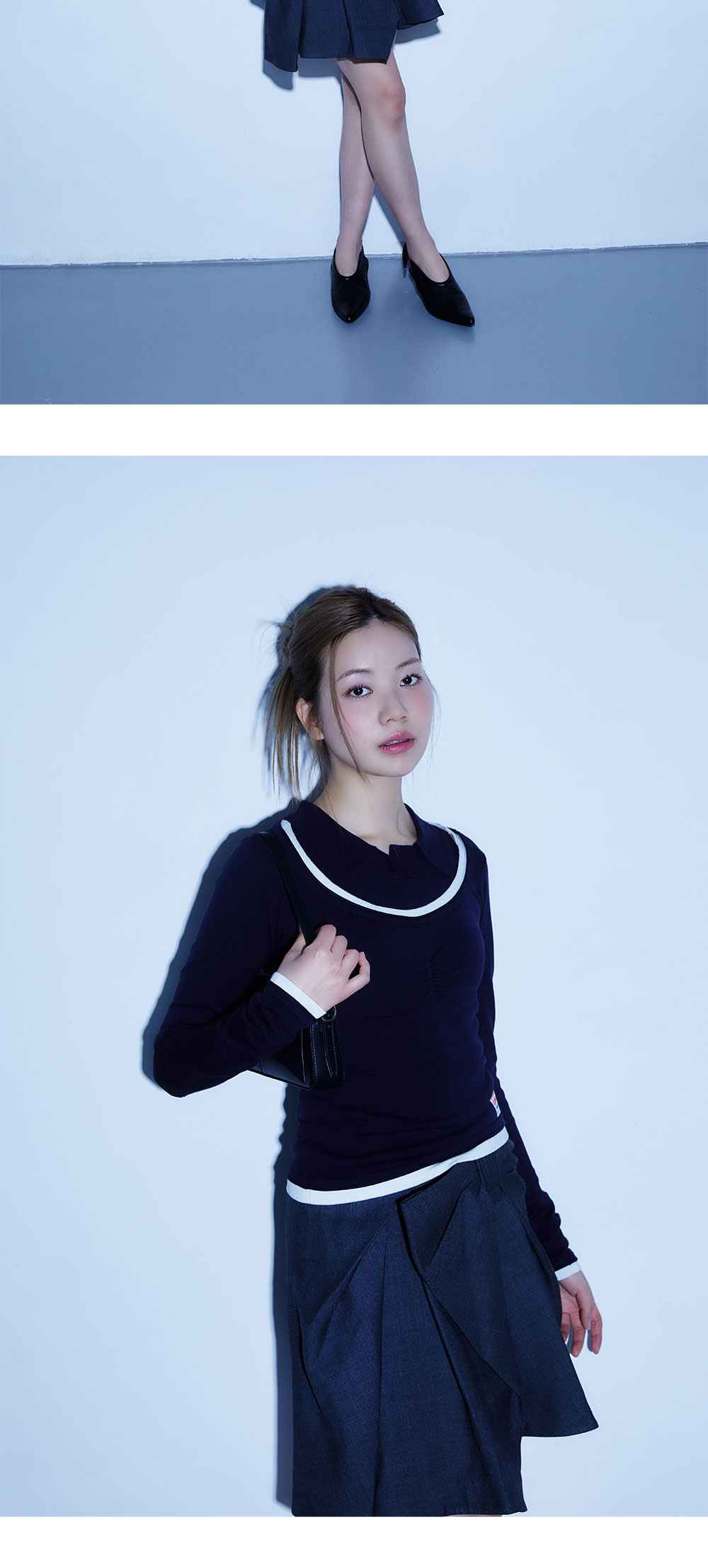 마크공 우먼 네이비 블루 투인원 니트 레이어드 탑 네이비 블루 입니다. - 셔츠 칼라와 U넥이 겹쳐진 투인원 구조 - 넥라인과 밑단 화이트 바인딩 배색 - 전면 중앙부 섬세한 셔링 디테일 - 하단 측면 브랜드 로고 패치 포인트