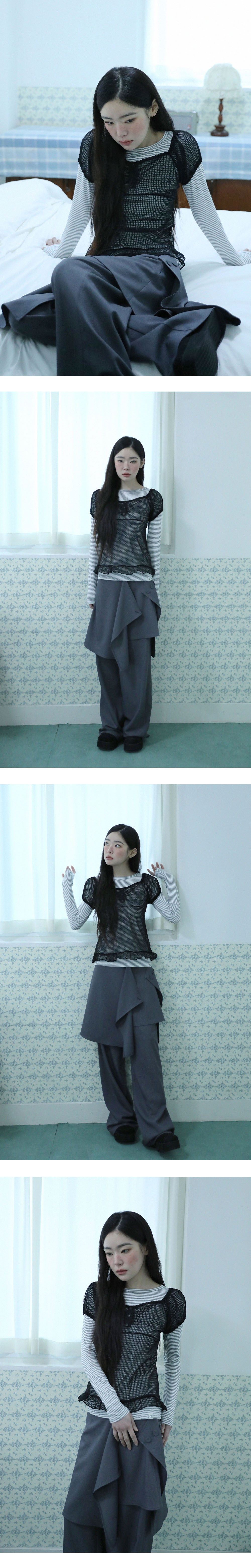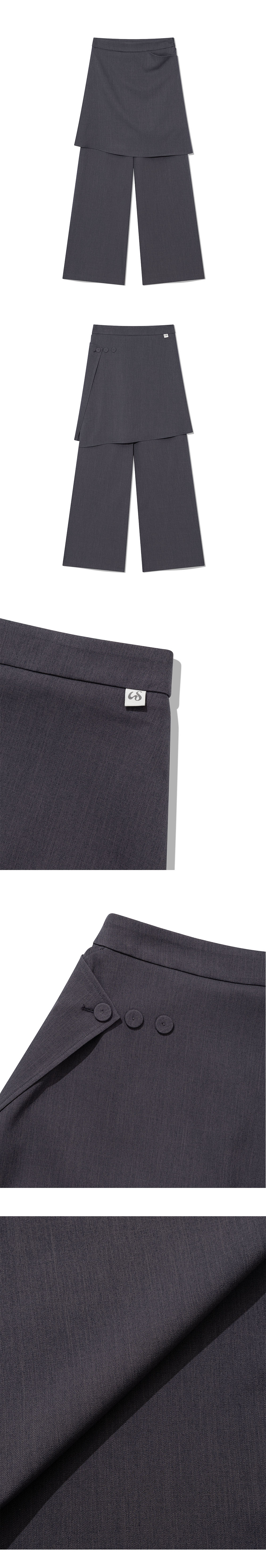 [MADE IN KOREA] [Material] Polyester 95%, Spandex 5% [Date of Manufacture] 2026.02 [Model] 167cm / Top (S) Bottom (S) ** Model Fitting Size : S [Size Guide] S : Waist 35 Hip 51 Rise 31 Thigh 31 Total Length 106 (cm) M : Waist 37 Hip 53 Rise 33 Thigh 33 Total Length 107 (cm) * 측정 방식에 따라 1-2 cm 오차가 있을 수 있습니다. * 화면에 따라 실제 색상이 차이가 날 수 있습니다. 플레어 스커트 실루엣의 팬츠로, 싸개 단추 디테일이 포인트인 아이템입니다. 단추의 잠금 여부는 개인 취향에 따라 자유롭게 착용하실 수 있습니다. * 드라이클리닝 권장 * 손세탁 시 중성세제 사용, 비틀기 금지 * 건조기 사용 금지, 그늘 자연건조 * 러플·리본·프린팅 부분 문지르지 말 것