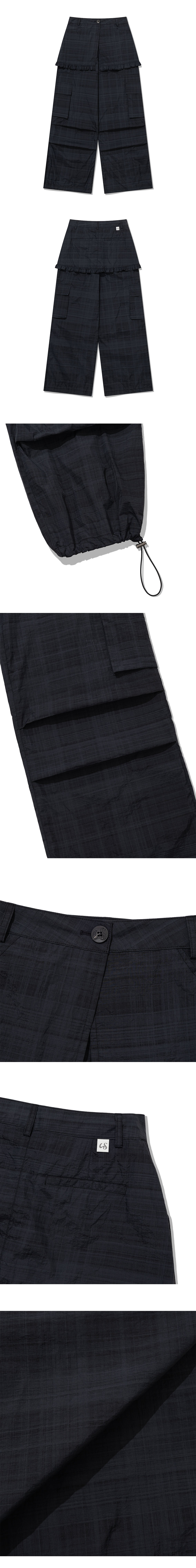 [MADE IN KOREA] [Material] Nylon 100% [Date of Manufacture] 2026.02 [Model] 167cm / Top (S) Bottom (S) ** Model Fitting Size : S [Size Guide] S : Waist 36 Hip 53 Rise 35 Thigh 31 Total Length 107 (cm) M : Waist 38 Hip 55 Rise 37 Thigh 33 Total Length 108 (cm) * 측정 방식에 따라 1-2 cm 오차가 있을 수 있습니다. * 화면에 따라 실제 색상이 차이가 날 수 있습니다. 체크 원단의 프릴 스커트가 레이어드된 카고 팬츠입니다. * 드라이클리닝 권장 * 손세탁 시 중성세제 사용, 비틀기 금지 * 건조기 사용 금지, 그늘 자연건조 * 러플·리본·프린팅 부분 문지르지 말 것