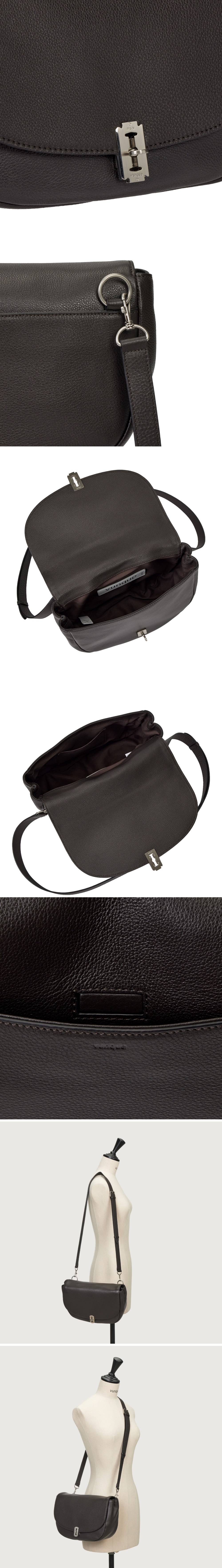 라운드 쉐입의 플랩과 바디가 포인트인 숄더백통수납형 디자인으로 넉넉한 수납력이 특징뒷면에 외부 포켓이 있음크로스 스트랩은 매듭지어 길이 조절 가능크로스 착용 가능