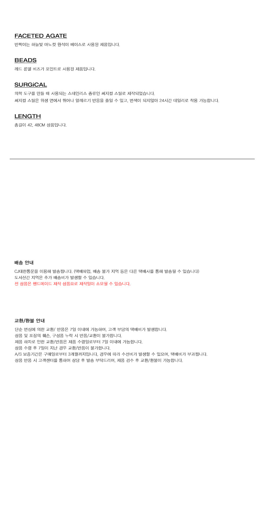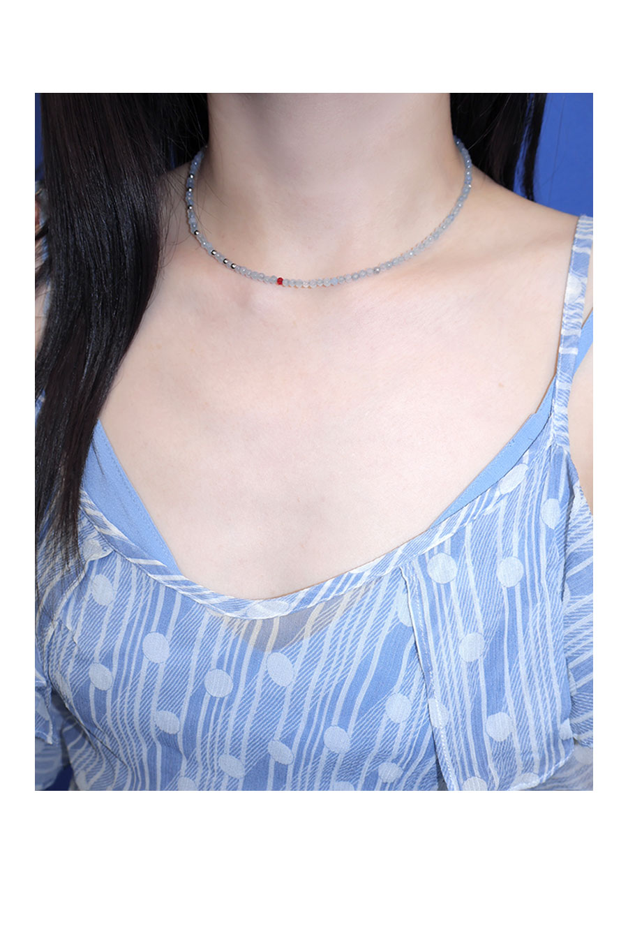 NiRO의 모든 제품은 핸드메이드로 주문 후 최대 10일 이내에 걸쳐 주문 제작됩니다. 옵션 주문 제작 시 원하는 길이를 배송 메세지에 기재해 주세요. 반짝이는 하늘빛 마노컷 원석을 베이스로 레드 론델 비즈가 포인트인 목걸이입니다. 여성 추천 사이즈 42cm 남성 추천 사이즈 48cm