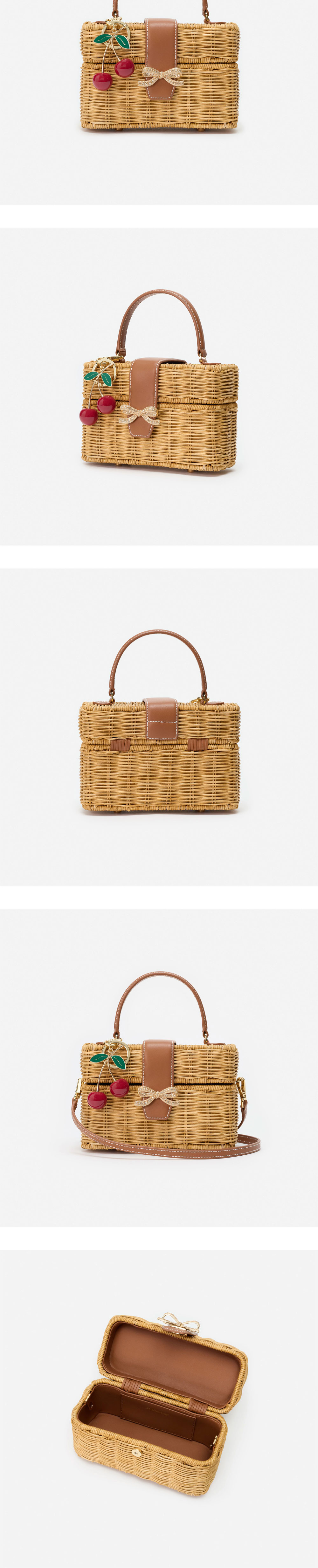 셀프 포트레이트 우먼 라탄 체리 참 미니 바스켓 백 브라운입니다. - 탈부착 가능한 체리 모양 참 - 형태가 고정된 미니 바스켓 스타일 - 상단 플랩 클로저로 소지품을 안전하게 수납 가능 - 탈부착 가능한 숄더 체인 포함으로 투웨이 연출 지원