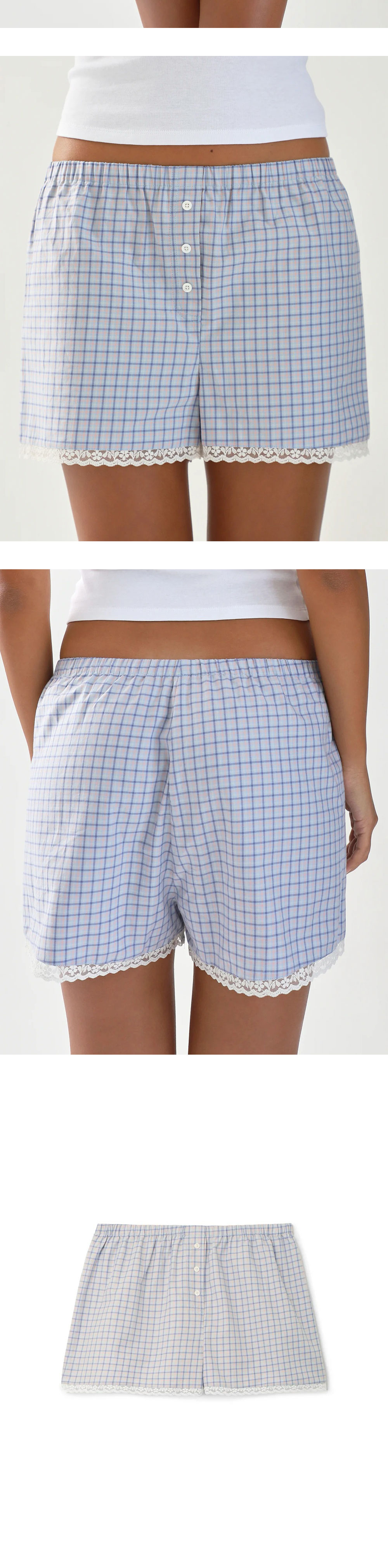 쿠쿠 인티메이트 우먼 더 박서 블루 체크입니다. - 100% 오가닉 프랑스산 포플린 & 플로럴 레이스 사용 - 편안한 로우라이즈 핏과 부드러운 엘라스틱 밴드 적용 - 통기성이 뛰어난 친환경 생분해성 소재로 제작 - 데일리 라운지웨어 및 언더웨어로 활용 가능한 디자인