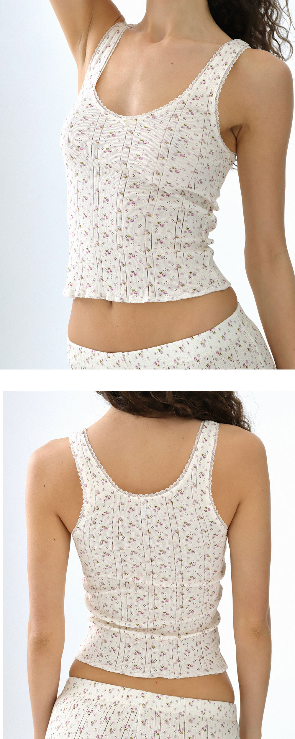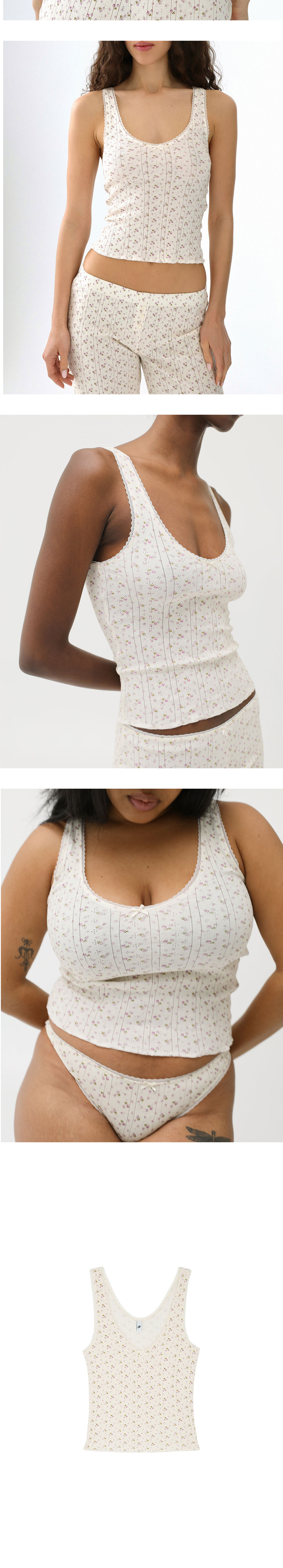 쿠쿠 인티메이트 우먼 더 스쿱 탱크 잉글리시 로즈 입니다. - 잔잔한 핑크 플로럴 패턴과 포인텔 니트 - 넥라인과 어깨선 프렌치 레이스 트리밍 - 전면 중앙에 리본 포인트 - 배꼽 아래까지 오는 세미 크롭 기장