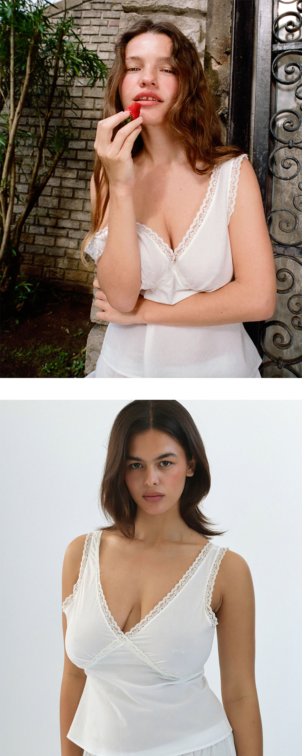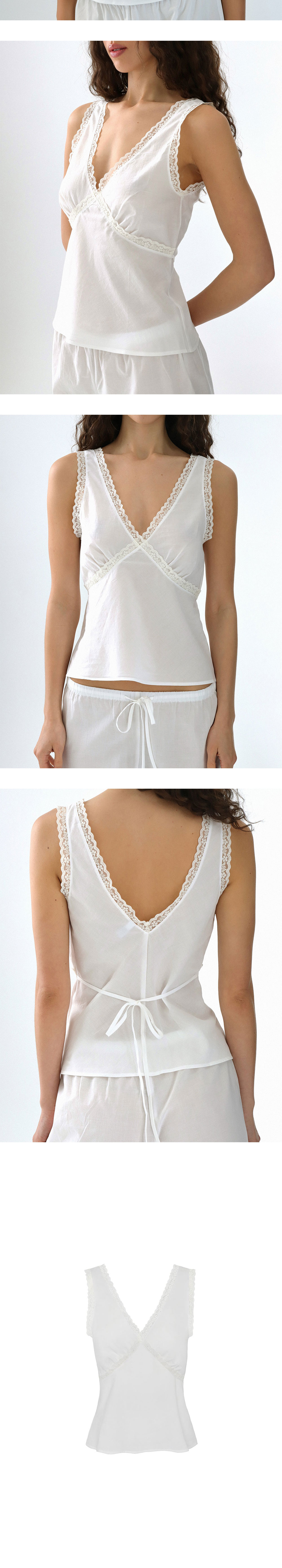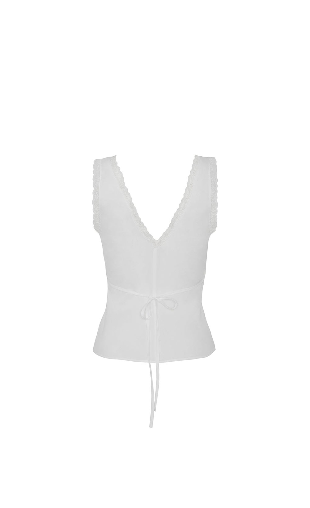 쿠쿠 인티메이트 우먼 더 아이리스 탱크 화이트 입니다. - 전·후면 깊은 V넥과 레이스 트리밍 - 허리 조절이 가능한 백 타이 - 가볍고 비침 있는 코튼 보일 소재 - 90년대 빈티지 무드의 페미닌한 실루엣