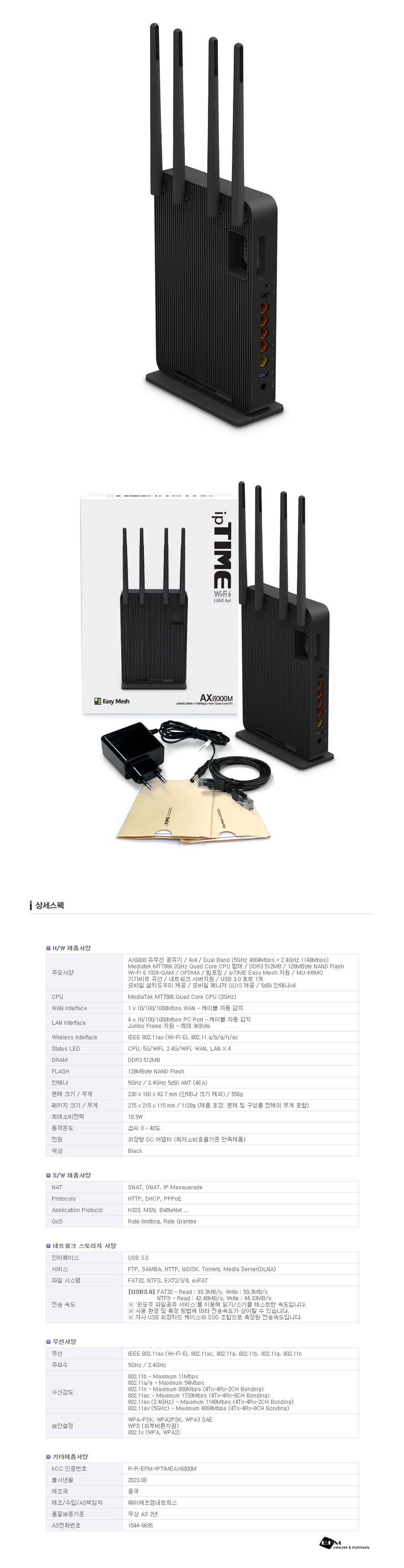 유무선 / 최고유선속도:1Gbps / 최고무선속도:4.8Gbps / AX6000(Wi-Fi 6) / 라우터형 / 전원플러그형 / 미디어텍 MT7986 / 쿼드 코어 / 2 GHz / 인터페이스:USB3.x 5Gbps / RAM:DDR3 512MB / FLASH:128MB / WAN:1포트(1Gbps) / LAN:4포트(1Gbps) / USB3.x 5Gbps:1개 /듀얼 밴드 / 안테나:4개 / Mesh / MU-MIMO / IPTV 지원 / DLNA / WOL / 모바일 관리 어플 / VPN / QoS / 빔포밍 / 모바일UI / OFDMA / 컨트롤러 / 무선 에이전트