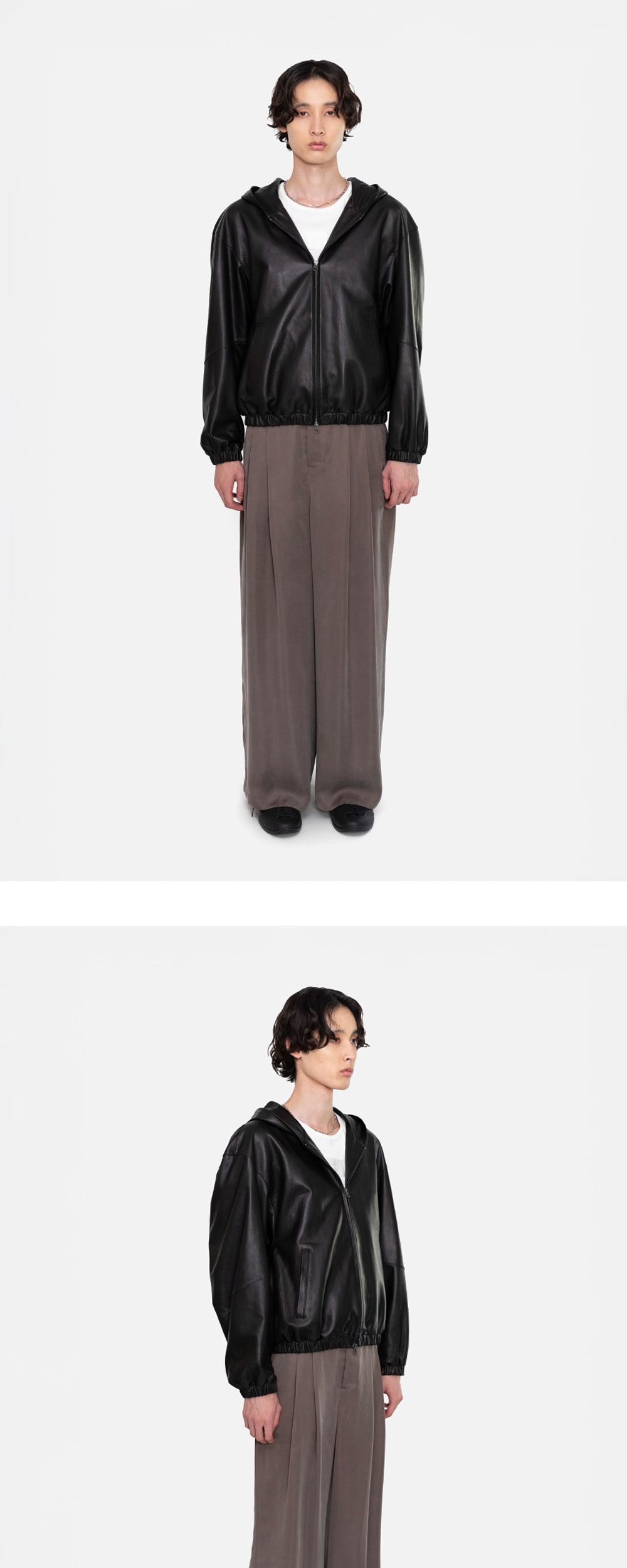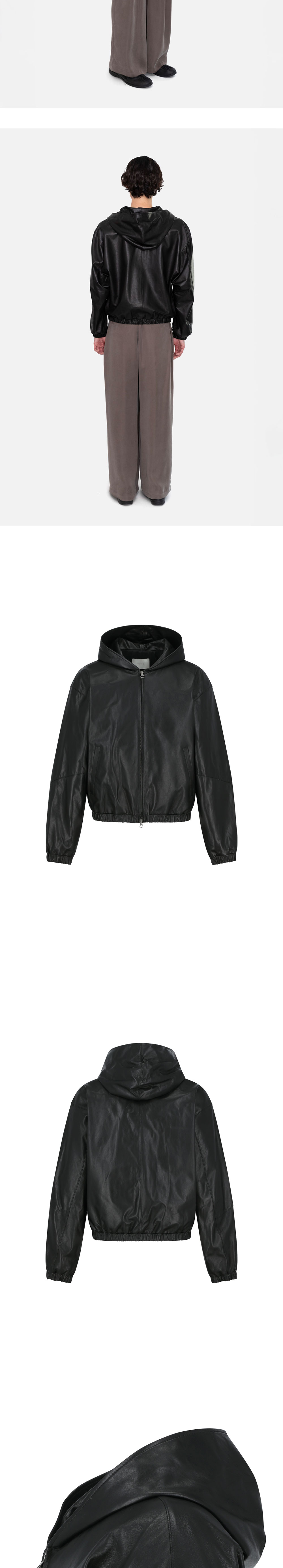 아모멘토 램 스킨 레더 후드 점퍼 블랙입니다. - 고급스러운 이태리 리얼 램 레더 소재 - 직선적인 어깨 라인과 여유로운 실루엣 - 소매 절개 디테일 - 투웨이 지퍼와 웰트 포켓으로 높은 실용성 - 소매 및 몸판 밑단 밴딩 처리 * 천연 가죽 소재 특성상 수분(비, 땀)과 열에 취약하므로 장시간 착용 시 물 빠짐 및 이염 가능성이 있습니다. * 표면의 오염은 부드러운 솔로 가볍게 털어내거나, 클리너 또는 가죽 전용 로션을 마른 천에 소량만 묻혀 닦아낸 후 바람이 잘 통하는 곳에서 건조하시기 바랍니다. * 천연 가죽 특성상 미세한 색상 차이, 갈라짐, 스크래치 등이 있을 수 있습니다. *모델 스펙: 185cm M Size 착용