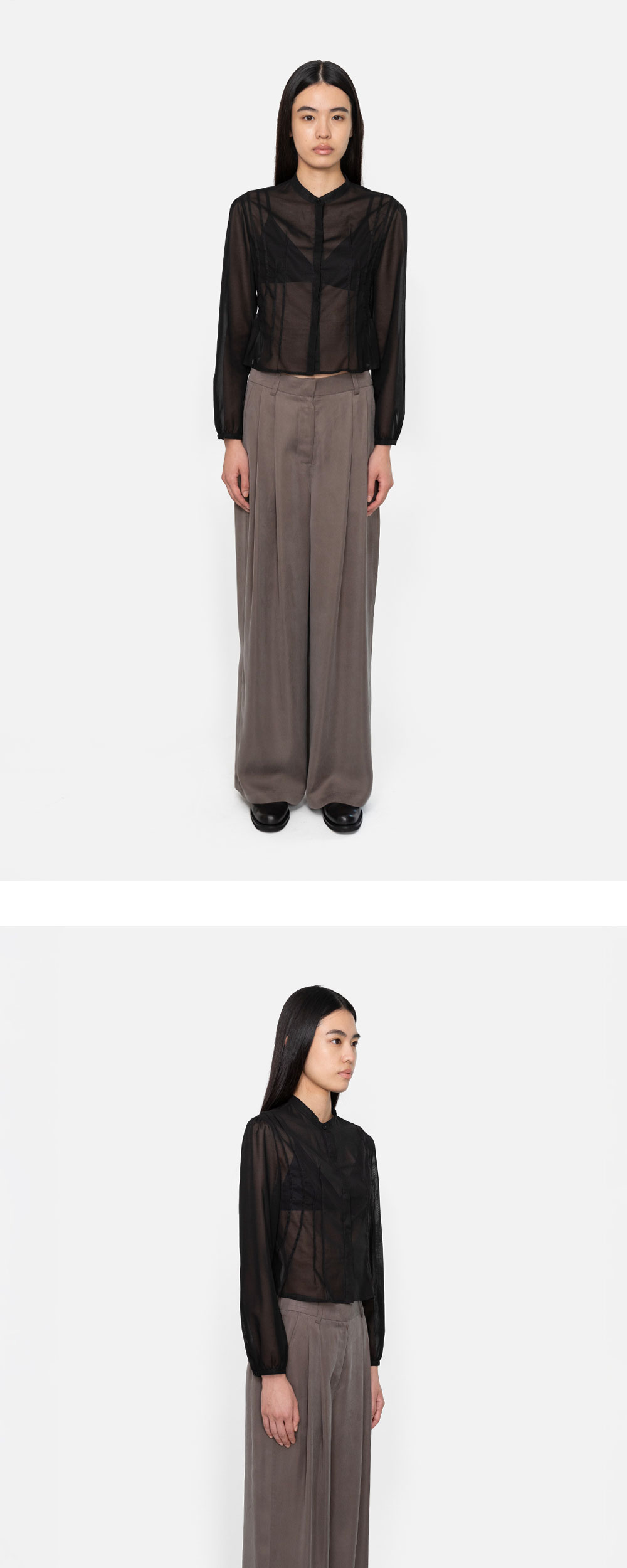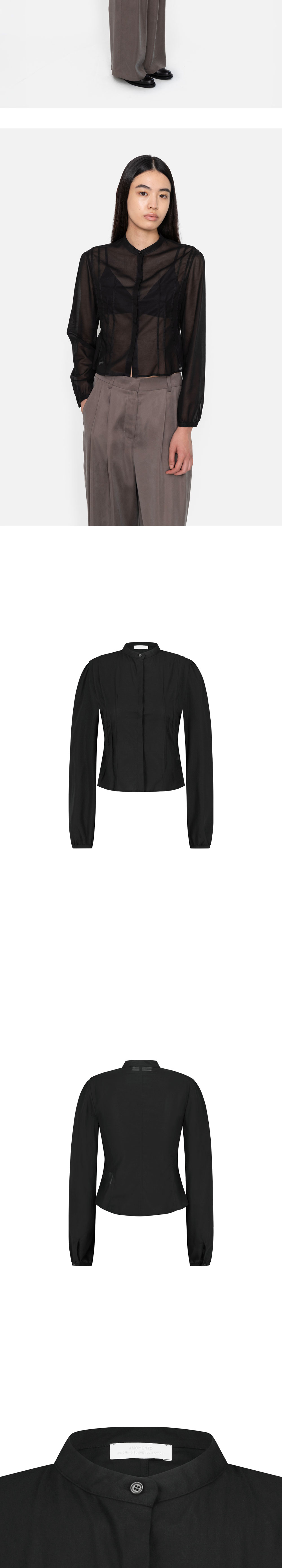 아모멘토 우먼 핀턱 슬림 셔츠 블랙입니다. - 은은한 비침의 시어한 원단 - 불규칙한 핀턱 디테일 - 소매 셔링으로 볼륨감 있는 실루엣 - 크롭 기장과 허리를 잡아주는 핏으로 깔끔한 실루엣 연출 *모델 스펙: 177cm 0 Size 착용