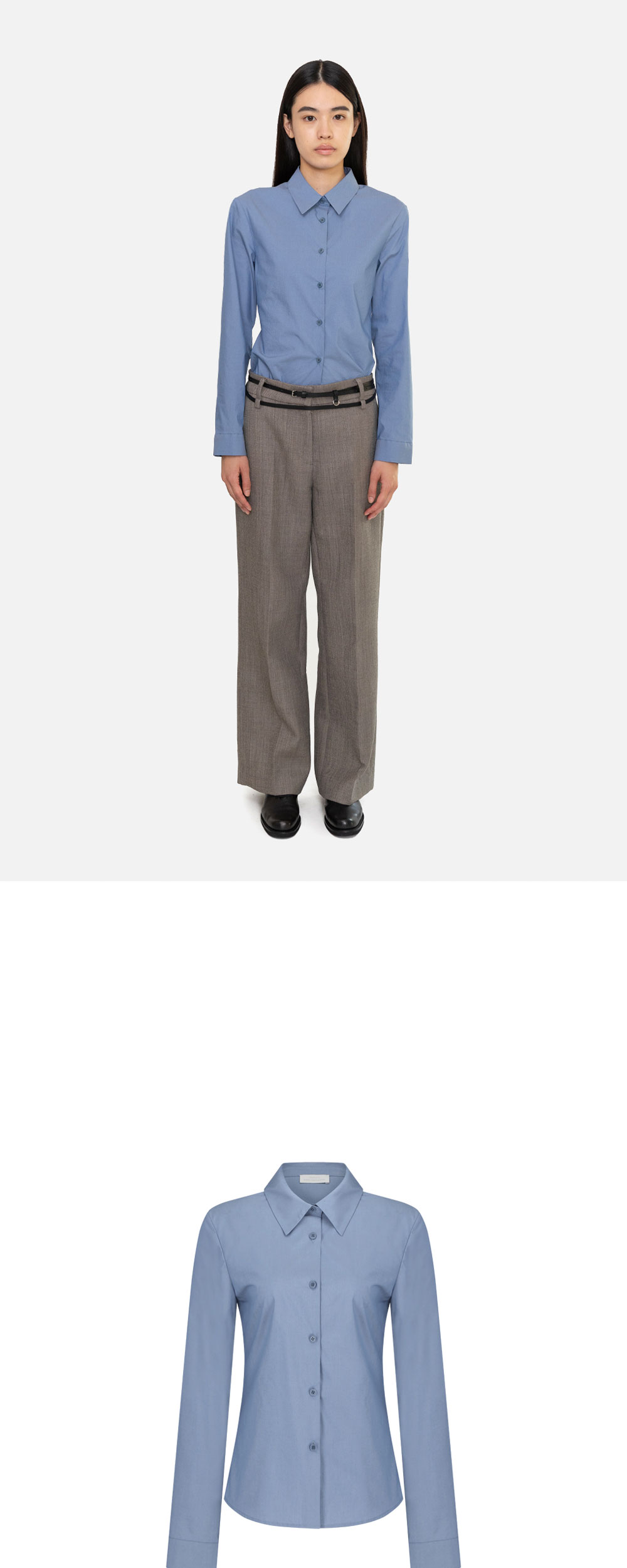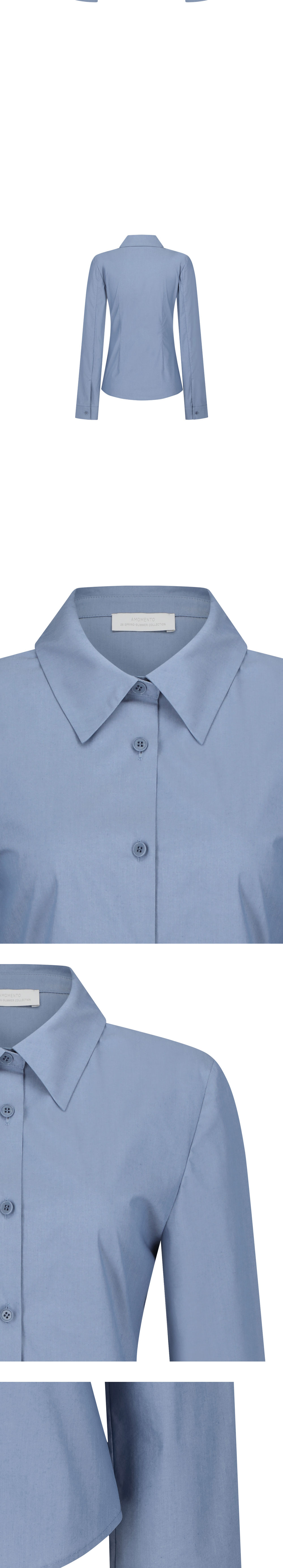 아모멘토 우먼 슬림 셔츠 블루입니다. - 탄탄한 소재감과 다양한 컬러감 - 스티치를 최소화한 미니멀한 디자인 - 다트 디테일을 통한 슬림한 실루엣 표현 - 단독 또는 레이어링 아이템으로 활용 가능 *모델 스펙: 177cm 0 Size 착용