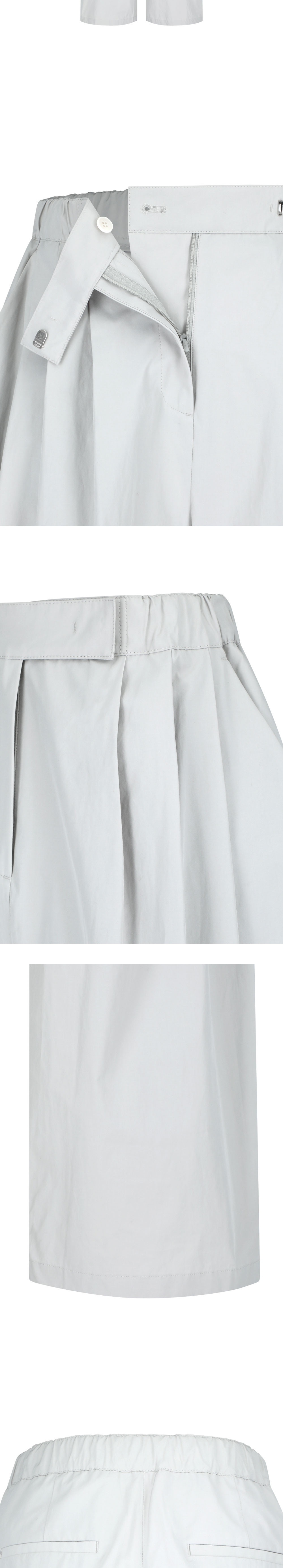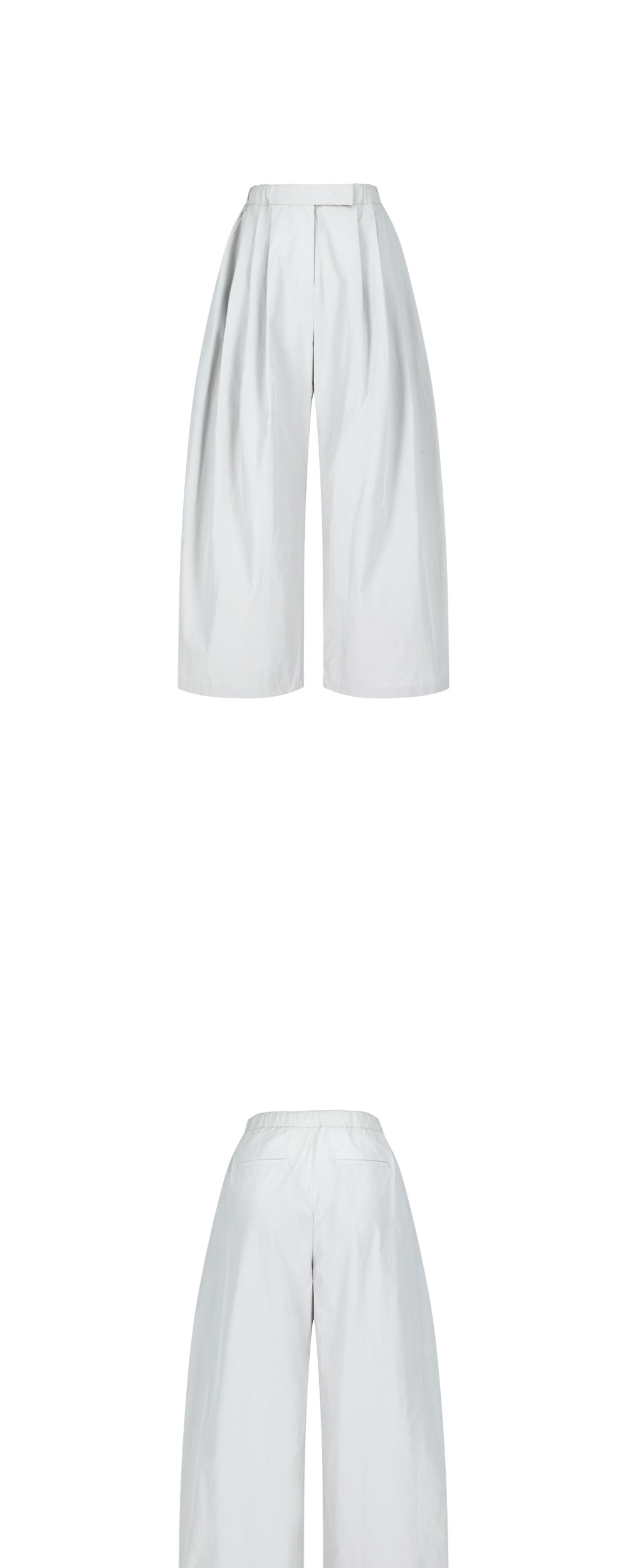 아모멘토 우먼 쓰리 턱 밴딩 팬츠 그레이입니다. - 쓰리턱 디테일로 강조된 볼륨감 있는 와이드 핏 - 뒷 허리 밴딩으로 편안한 착용감 - 밑단 단선을 라운디드로 처리하여 구조적인 실루엣 연출 - 크리스피한 터치감의 원단으로 가볍고 시원한 착용감