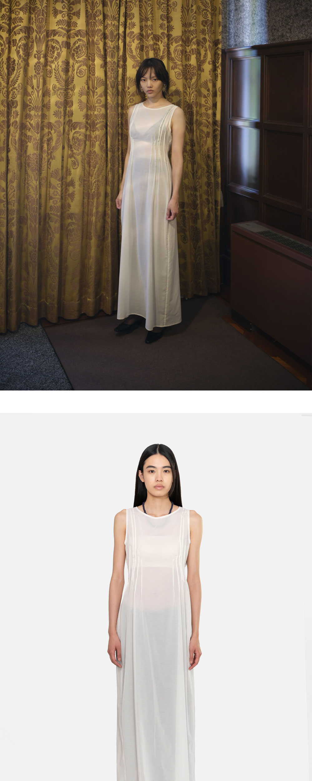 아모멘토 우먼 핀턱 드레스 블랙입니다. - 불규칙한 핀턱 디테일로 허리 실루엣 강조 - 시어한 원단으로 높은 레이어드 활용도 - 맥시한 기장으로 우아한 실루엣 연출 - 뒷중심 트임으로 편안한 착용감 *모델 컷은 제품의 실제 컬러와 다른 점 참고 부탁드립니다. *모델 스펙: 177cm 0 Size 착용