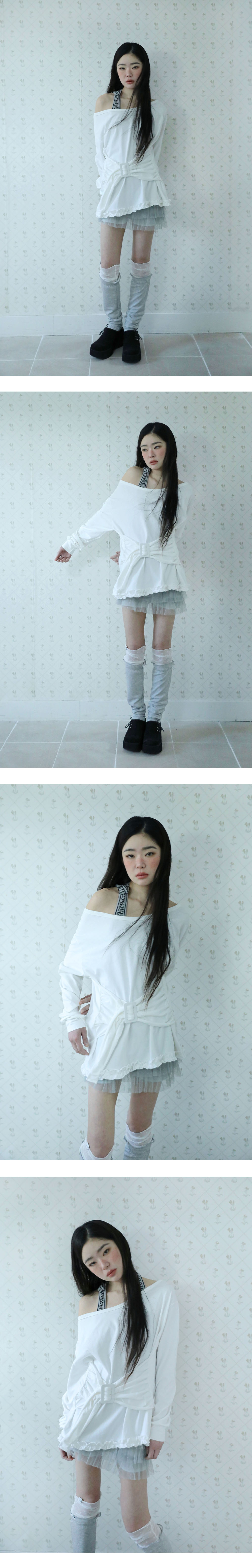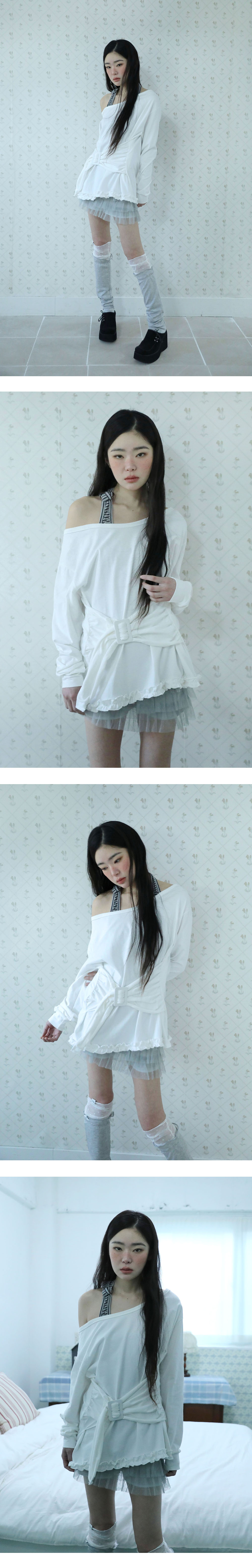[MADE IN KOREA] [Material] Cotton 100% [Date of Manufacture] 2026.02 [Model] 167cm / Top (S) Bottom (S) ** Model Fitting Size : F [Size Guide] F : Shoulder 53 Chest 47 Sleeve 56.5 Total Length 66 (cm) * 측정 방식에 따라 1-2 cm 오차가 있을 수 있습니다. * 화면에 따라 실제 색상이 차이가 날 수 있습니다. 버클 디테일과 밑단 프릴이 포인트인 오프숄더 티셔츠 입니다. * 드라이클리닝 권장 * 손세탁 시 중성세제 사용, 비틀기 금지 * 건조기 사용 금지, 그늘 자연건조 * 러플·리본·프린팅 부분 문지르지 말 것