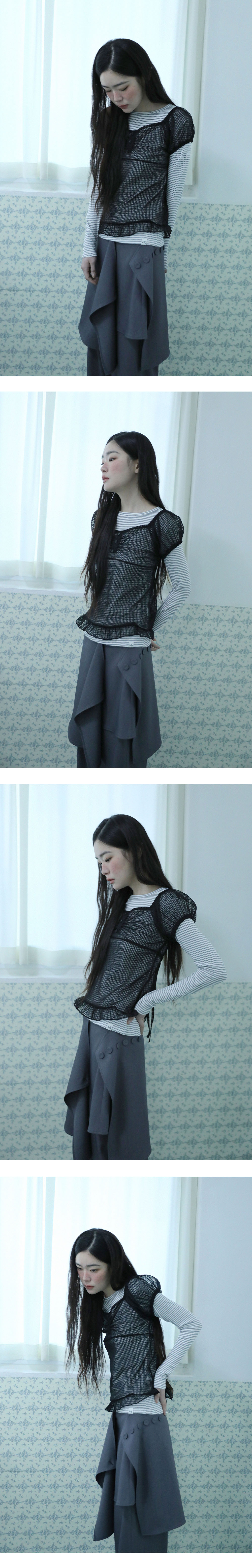 [MADE IN KOREA] [Material] Polyester 100% [Date of Manufacture] 2026.02 [Model] 167cm / Top (S) Bottom (S) ** Model Fitting Size : F [Size Guide] F : Shoulder 40 Chest 39 Sleeve 15 Total Length 58 (cm) * 측정 방식에 따라 1-2 cm 오차가 있을 수 있습니다. * 화면에 따라 실제 색상이 차이가 날 수 있습니다. 도트와 스트라이프 패턴을 결합한 시스루 블라우스입니다. 뒷밴딩과 허리에 더해진 리본 디테일로 사이즈 조절이 가능해 슬림한 실루엣을 연출합니다. * 드라이클리닝 권장 * 손세탁 시 중성세제 사용, 비틀기 금지 * 건조기 사용 금지, 그늘 자연건조 * 러플·리본·프린팅 부분 문지르지 말 것