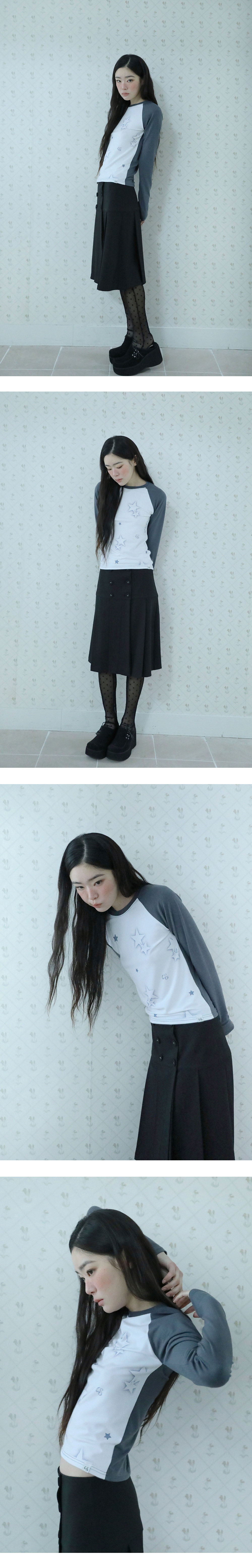 [MADE IN KOREA] [Material] Polyester 62%, Rayon 34%, Spandex 4% [Date of Manufacture] 2026.02 [Model] 167cm / Top (S) Bottom (S) ** Model Fitting Size : F [Size Guide] F : Shoulder 40 Chest 38 Sleeve 61 Total Length 55 (cm) * 측정 방식에 따라 1-2 cm 오차가 있을 수 있습니다. * 화면에 따라 실제 색상이 차이가 날 수 있습니다. US 로고와 별 로고 모티브를 피그먼트 워싱처럼 표현해 하나의 패턴으로 완성한 래그런 티셔츠입니다. * 드라이클리닝 권장 * 손세탁 시 중성세제 사용, 비틀기 금지 * 건조기 사용 금지, 그늘 자연건조 * 러플·리본·프린팅 부분 문지르지 말 것