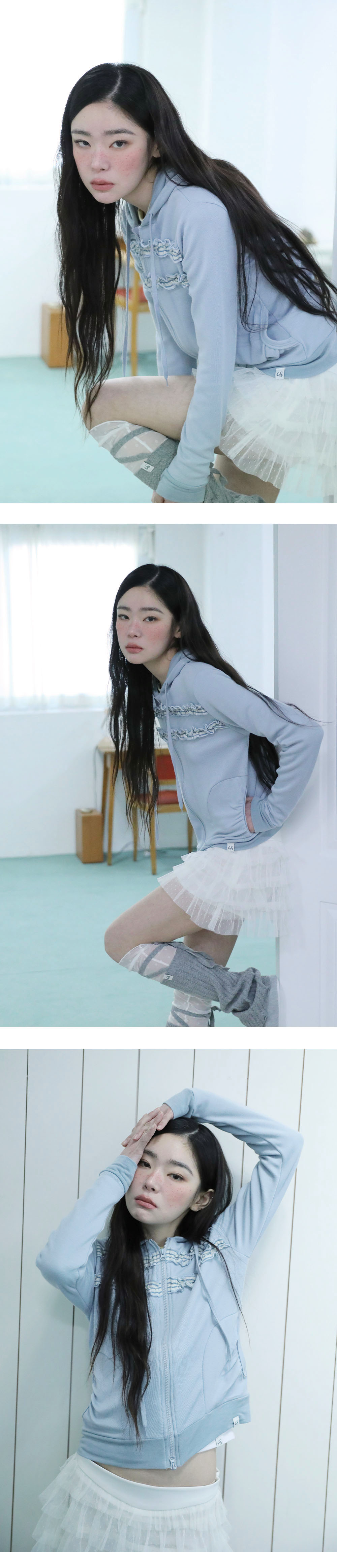 [MADE IN KOREA] [Material] Polyester 67%, Rayon 29%, Spandex 4% [Date of Manufacture] 2026.02 [Model] 167cm / Top (S) Bottom (S) ** Model Fitting Size : F [Size Guide] F : Shoulder 40 Chest 46 Sleeve 61.5 Total Length 59 (cm) * 측정 방식에 따라 1-2 cm 오차가 있을 수 있습니다. * 화면에 따라 실제 색상이 차이가 날 수 있습니다. 레이어드 디테일이 포인트인 후드 집업입니다. 투웨이 지퍼로 활동성이 편안하며, 살짝 늘어지는 원단이 몸을 부드럽게 감싸 자연스럽게 떨어지는 핏을 연출합니다. * 드라이클리닝 권장 * 손세탁 시 중성세제 사용, 비틀기 금지 * 건조기 사용 금지, 그늘 자연건조 * 러플·리본·프린팅 부분 문지르지 말 것