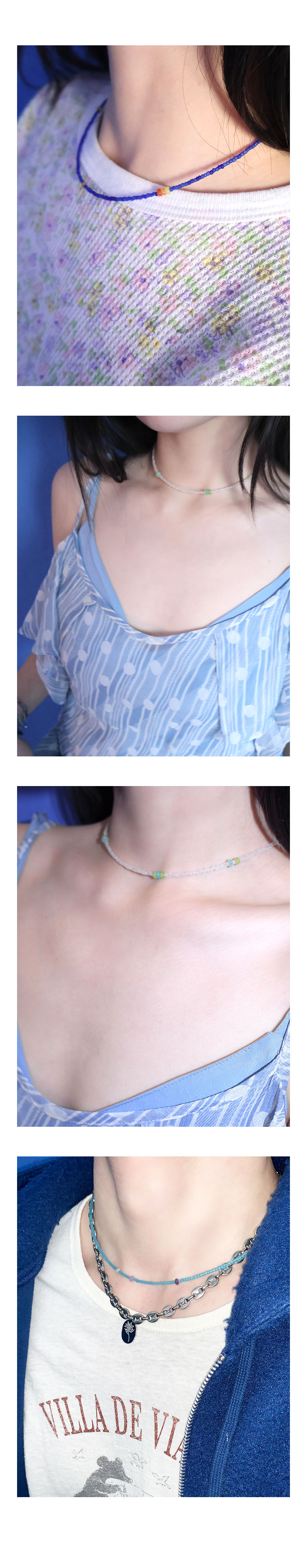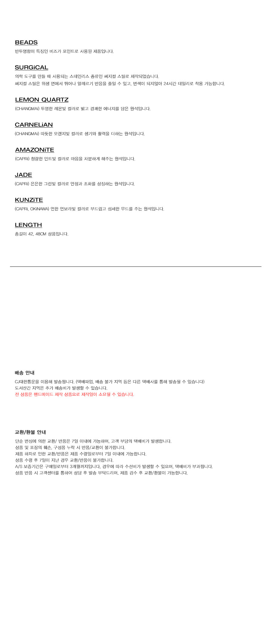 NiRO의 모든 제품은 핸드메이드로 주문 후 최대 10일 이내에 걸쳐 주문 제작됩니다. 옵션 주문 제작 시 원하는 길이를 배송 메세지에 기재해 주세요. 반투명한 비즈를 베이스로 젤리를 닮은 원석이 포인트인 목걸이입니다. 컬러마다 각기 다른 휴양지의 분위기를 담고 있습니다. 여성 추천 사이즈 42cm 남성 추천 사이즈 48cm