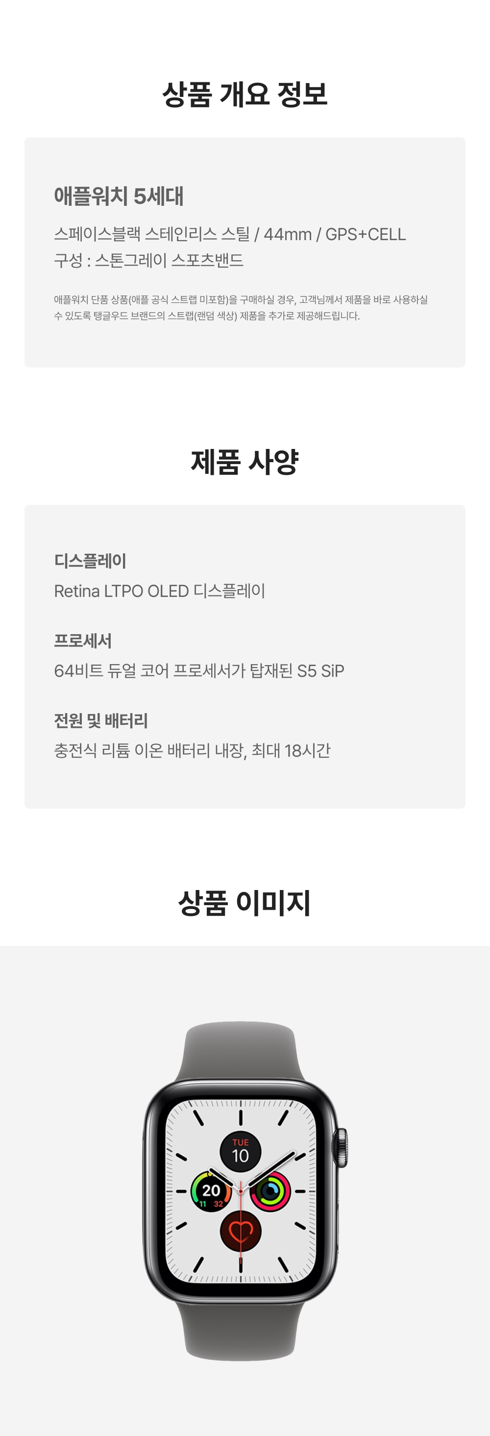 [S등급] 리퍼비시 애플워치 5 44mm GPS+Cellular 스페이스블랙 스테인리스 스틸 케이스 스포츠 밴드 스톤그레이