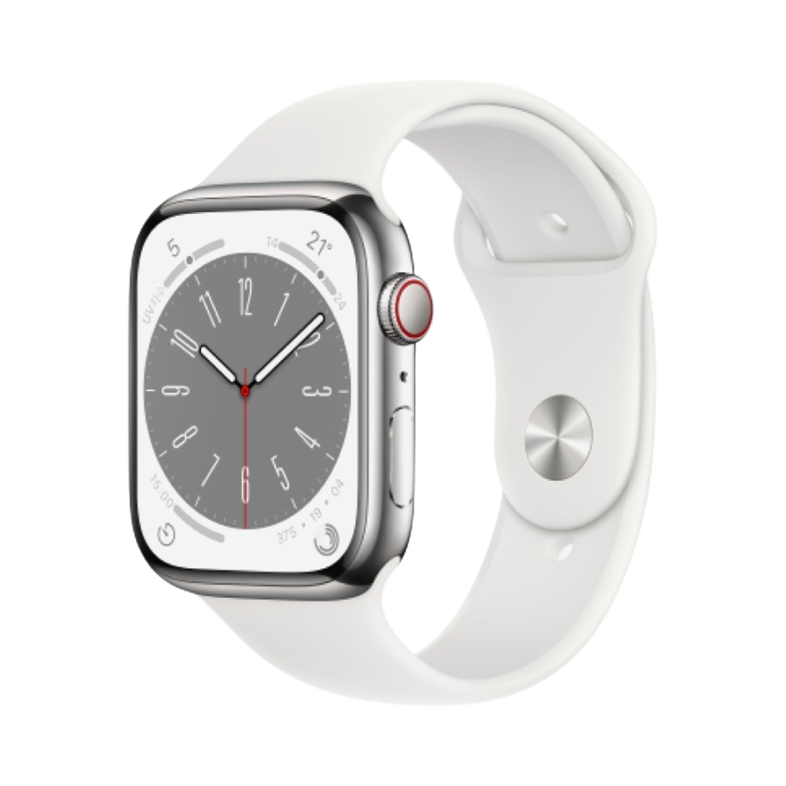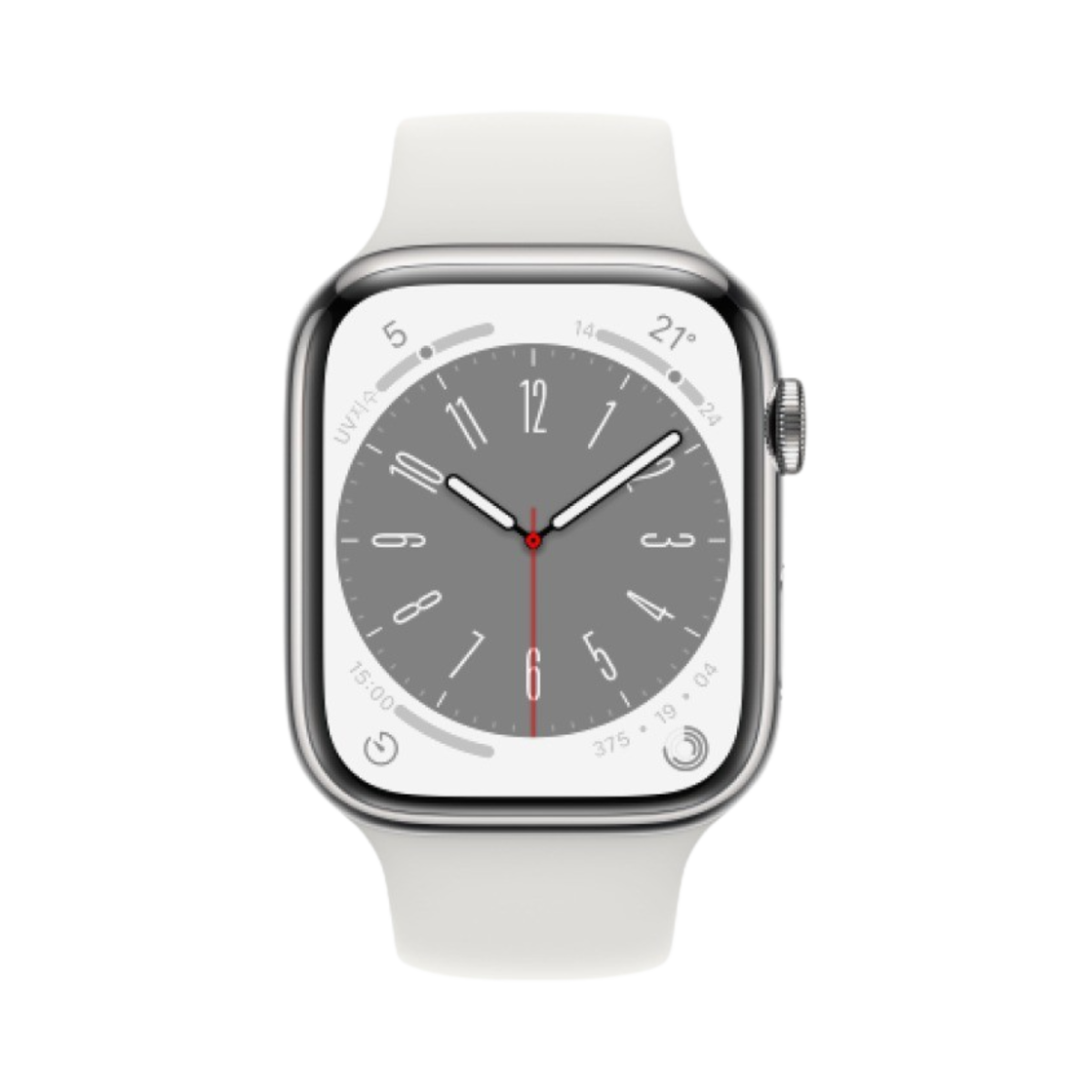 애플 워치 8 45mm 셀룰러 실버 스테인리스 스틸 케이스 스포츠 밴드 화이트 (국내 정식 발매 제품)
