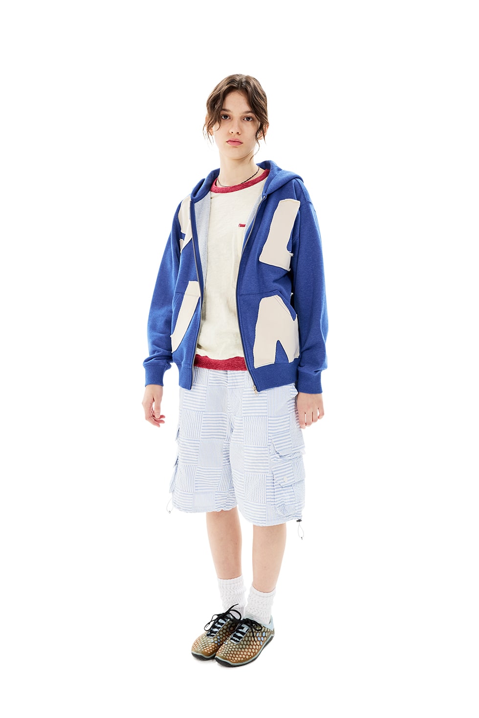 · 캐피탈 후드 집업 · 면, 폴리에스터 혼방 원단 사용 · 기모 없음 · 폴리에스터 원사와 면 원사를 적절히 혼방하여 가볍고 스포티한 느낌 · 유연하고 소프트한 터치감 · 밑단, 소맷단 밴딩 처리 · 캥거루 포켓 · 전면에 YKK 지퍼 사용 · 캐피탈 그래픽 Raw edge 아플리케 Cotton 54% Polyester 46% Made in China Male - Large/187.5cm,Female - Small/169.5cm