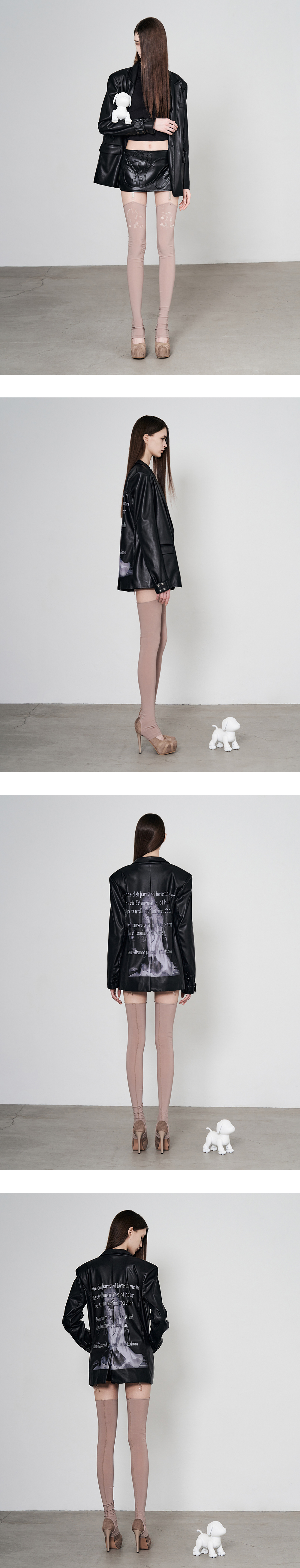 Model is 174cm wears size 1 허벅지 기장 스타킹 실루엣 앞 레터링 레이저 컷팅 디테일 안정적인 착용을 위한 발 고리 디테일 로우컷 마감 디테일 가볍고 부드러운 스트레치 원단으로 편안한 착용감 Size(Length/Top Width/Bottom Width) 1 : 81cm/14.5cm/10cm Polyester 95% Polyurethane 5%