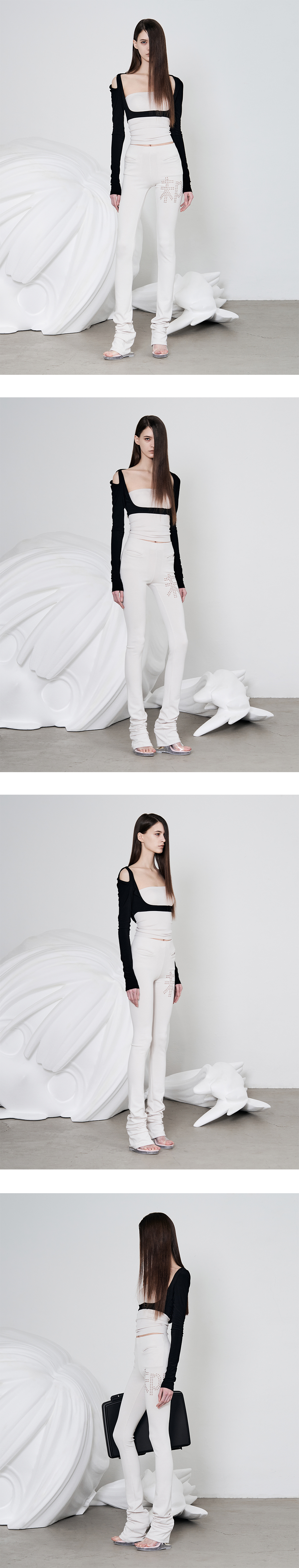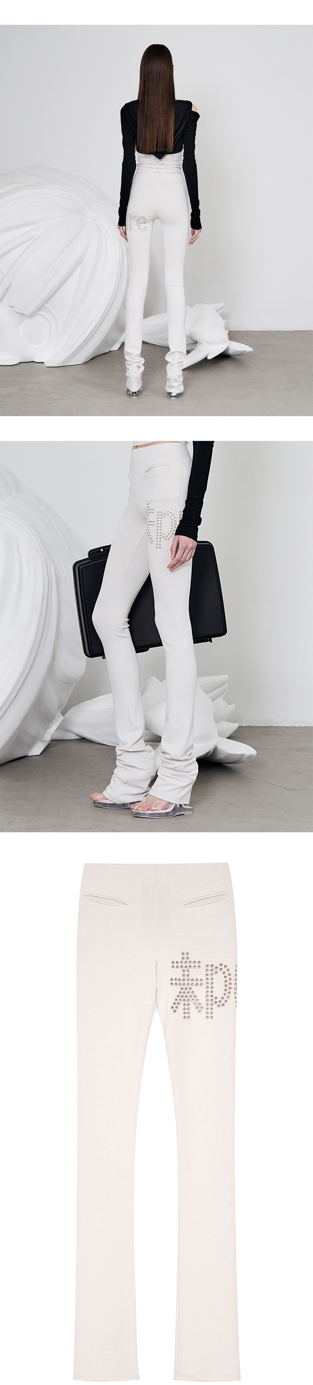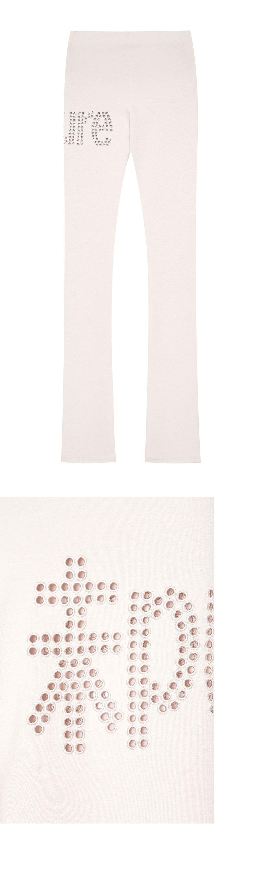 Model is 174cm wears size 1 슬림 핏 레깅스 허리 밴드 내장 밑단 스택드(주름) 디테일 앞 사이드 주머니 내장 펀칭 아일렛 자수 디테일 신축성 있는 원단으로 편안한 착용감 Size(Length/Waist/Hip/Thigh/Crotch) 1 : 123cm/27.5cm/36cm/25cm/20cm 2 : 124cm/30cm/38.5cm/26cm/21cm 3 : 125cm/32.5cm/40cm/27cm/23cm Polyester 68% Rayon 26% Spandex 6%