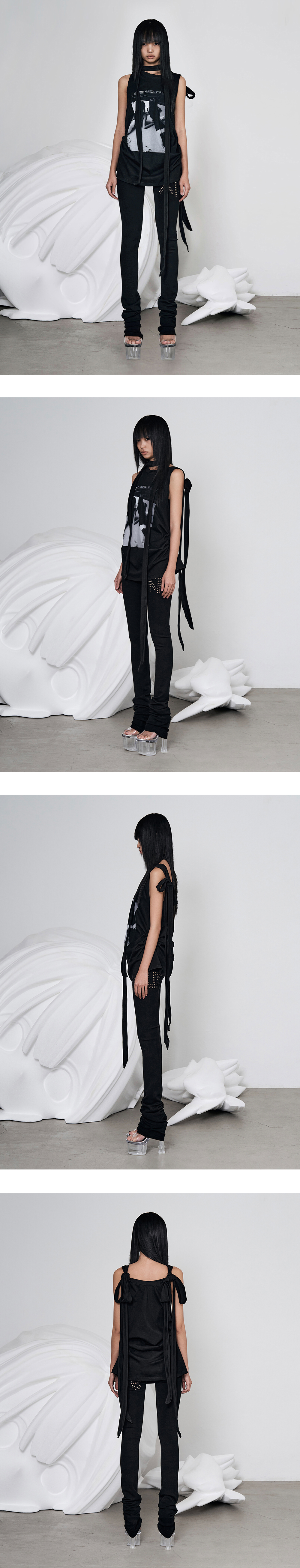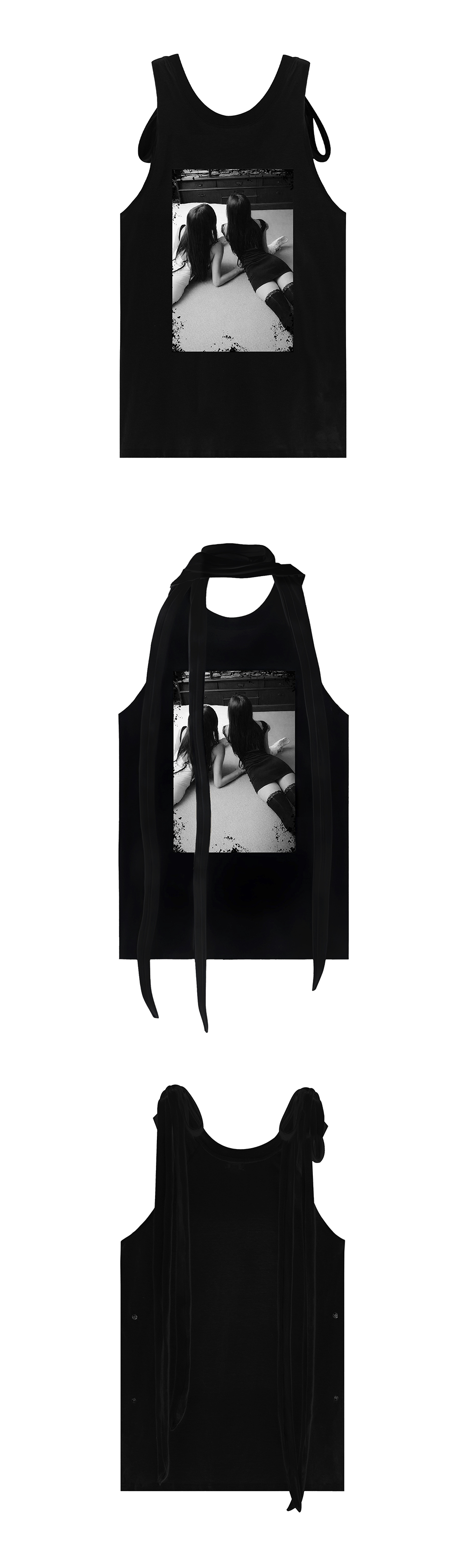 Model is 170cm wears size 1 그래픽 프린팅 슬리브리스 탑 긴 어깨 스트랩 디테일 머플러 또는 리본 연출 등 다양한 스타일 연출 가능 앞 그래픽 프린팅 디테일 깊은 암홀 라인 사이드 스냅 장식으로 드레이프 실루엣 연출 가능 20수 코튼 원단 Size(Length/Shoulder/Chest) 1 : 76cm/32cm/49cm 2 : 76.5cm/32.5cm/51.5cm Cotton 100%