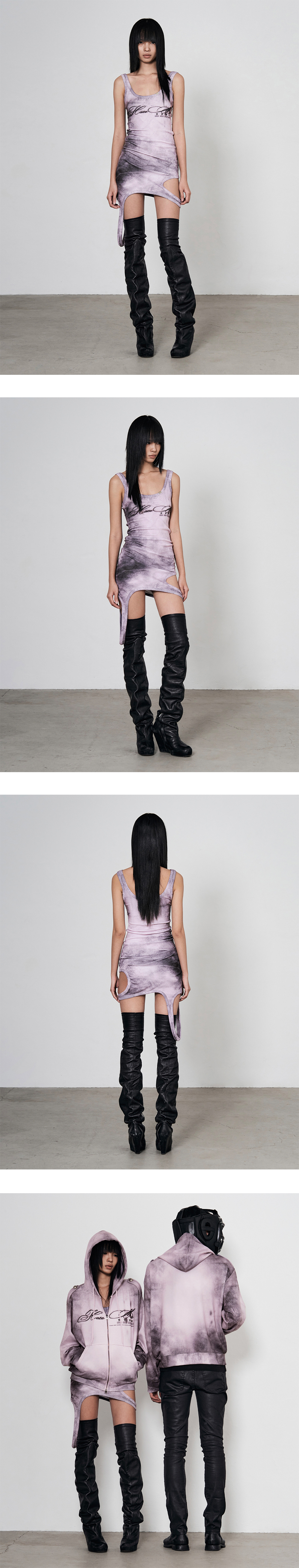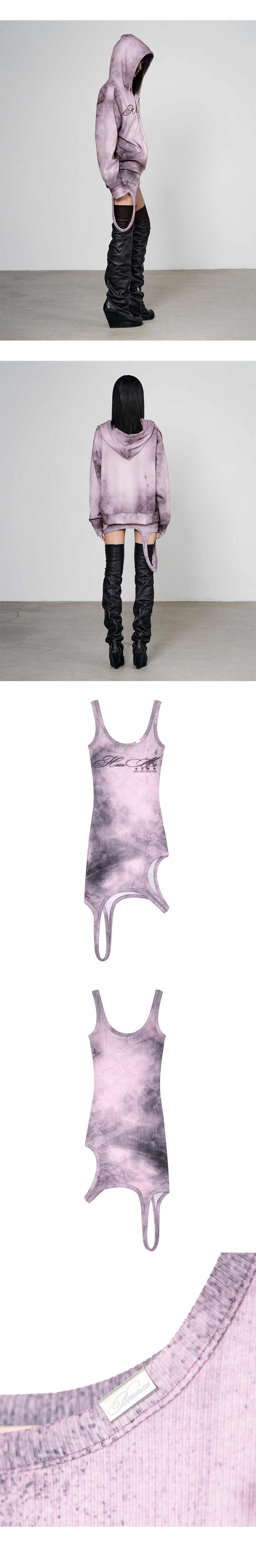 Model is 170cm wears size 1 그래픽 프린팅 슬리브리스 드레스 bonnae 로고 각인 레이스캡 디테일 밑단 비대칭 드레이프 스트랩 디테일 슬림 핏 실루엣 신축성 있는 가벼운 골지 원단으로 편안한 착용감 Size (Length short-long/Shoulder/Chest) 1 : 65cm-85cm/25cm/34cm 2 : 65.5cm-85cm/26cm/36.5cm Polyester 95% Spandex 5%