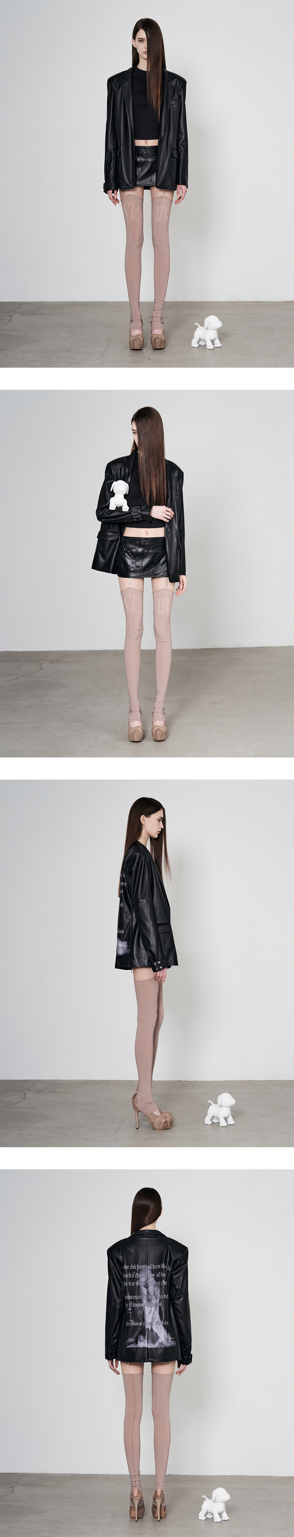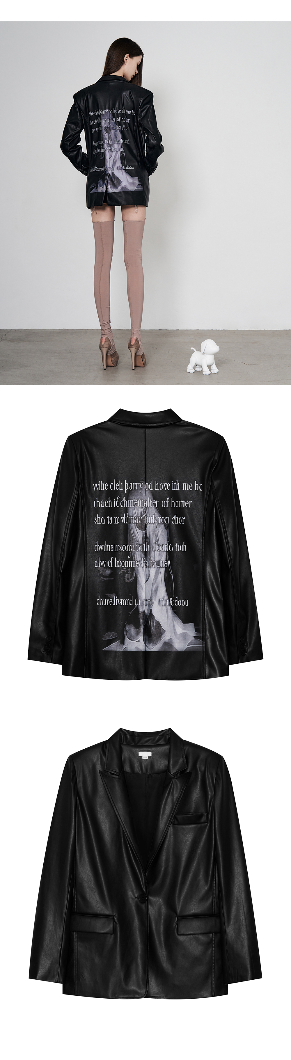 Model is 174cm wears size 1 스트레이트 핏 블레이저 어깨 패드 내장 그래픽 프린팅 디테일 소매, 앞 버튼 디테일 뒤 밑단 백 뒤트임 벤트 디테일 앞 포켓 디테일 가볍고 부드러운 합성 레더 원단 3사이즈 남녀공용 착용 가능 Size(Length/Shoulder/Chest/Sleeve) 1 : 71cm/44cm/50cm/61cm 3 : 73cm/48.5cm/55cm/63cm Polyurethane 100%