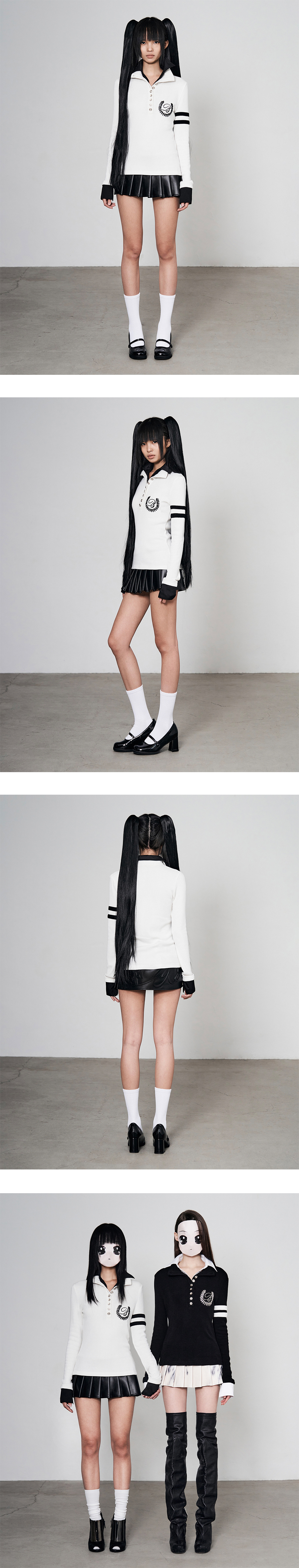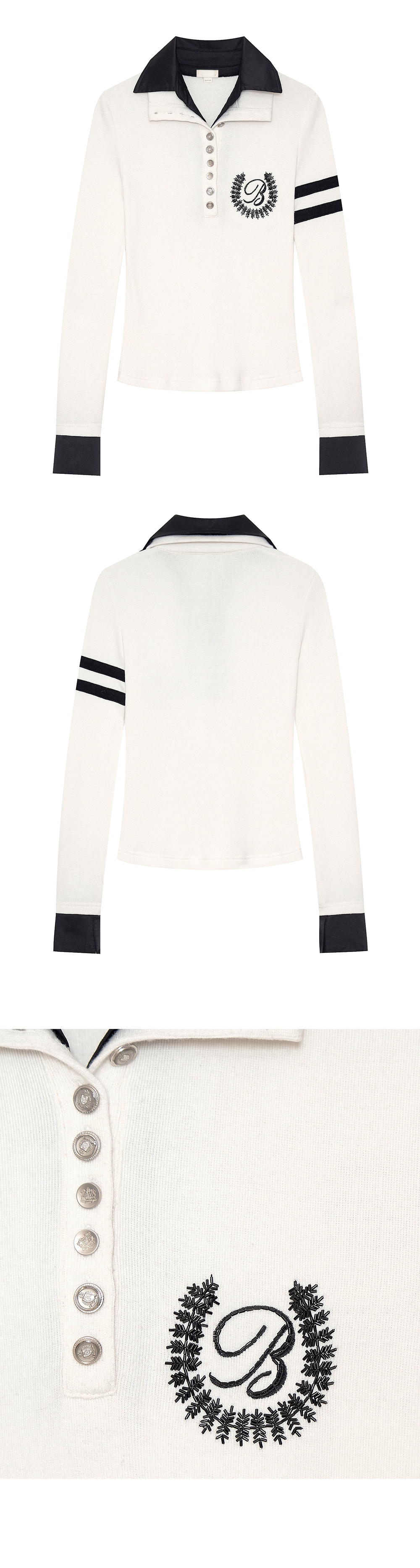 Model is 170cm wears size 1 배색 레이어드 더블 카라 디자인의 롱슬리브 폴로 탑 bonnae 로고 비즈 자수 디테일 부드럽고 신축성 있는 중간두께의 기모 원단 소매 두 줄 라인 디테일 전면 버튼 플래킷 디테일 슬림 스트레이트 핏 소매 셔츠 커프스 레이어드 디테일 Size(Length/Shoulder/Chest/Sleeve) 1 : 57.5m/40cm/40.5cm/67cm 2 : 58m/42cm/42.5cm/67cm Polyester 60% Rayon 35% Spandex 5%