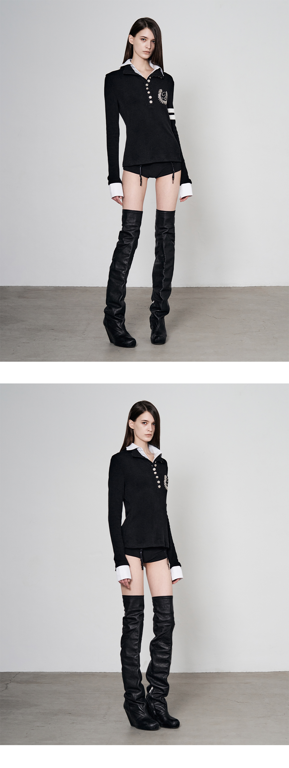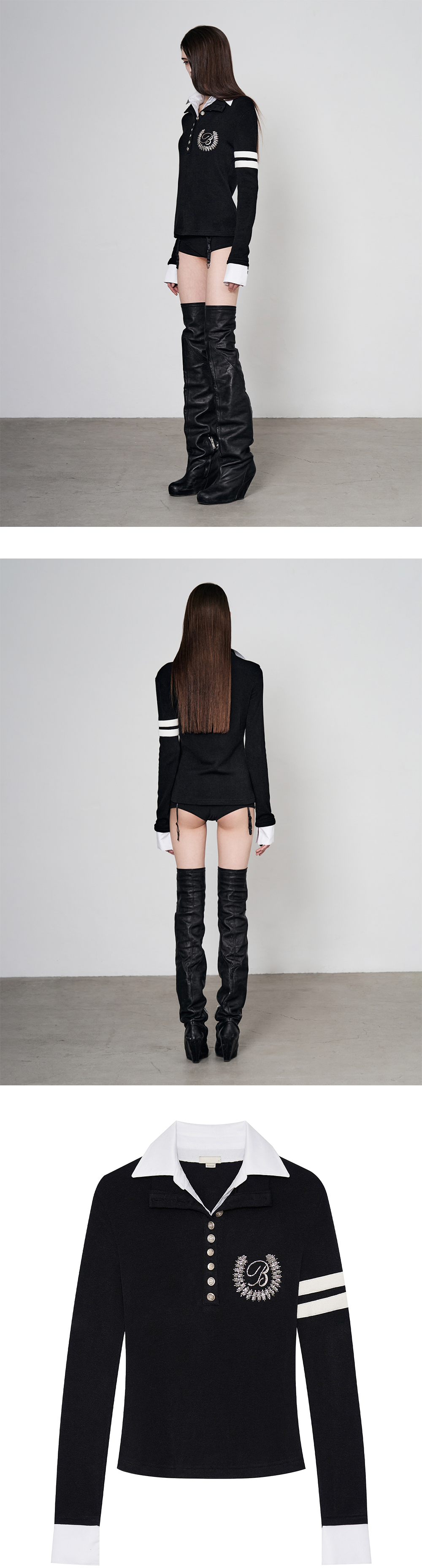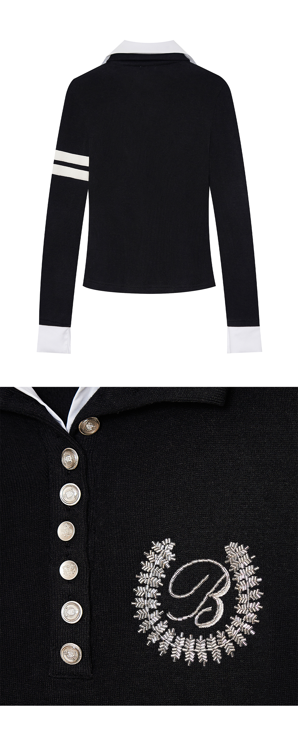 Model is 174cm wears size 1 배색 레이어드 더블 카라 디자인의 롱슬리브 폴로 탑 bonnae 로고 비즈 자수 디테일 부드럽고 신축성 있는 중간두께의 기모 원단 소매 두 줄 라인 디테일 전면 버튼 플래킷 디테일 슬림 스트레이트 핏 소매 셔츠 커프스 레이어드 디테일 Size(Length/Shoulder/Chest/Sleeve) 1 : 57.5m/40cm/40.5cm/67cm 2 : 58m/42cm/42.5cm/67cm Polyester 60% Rayon 35% Spandex 5%