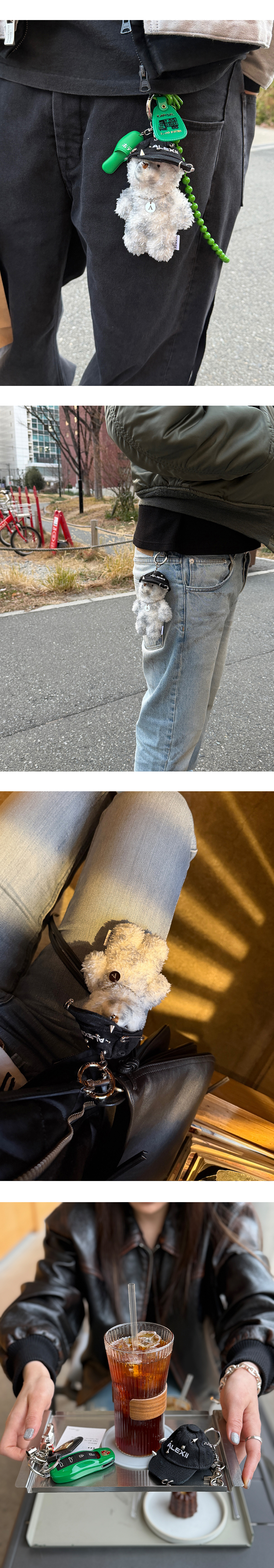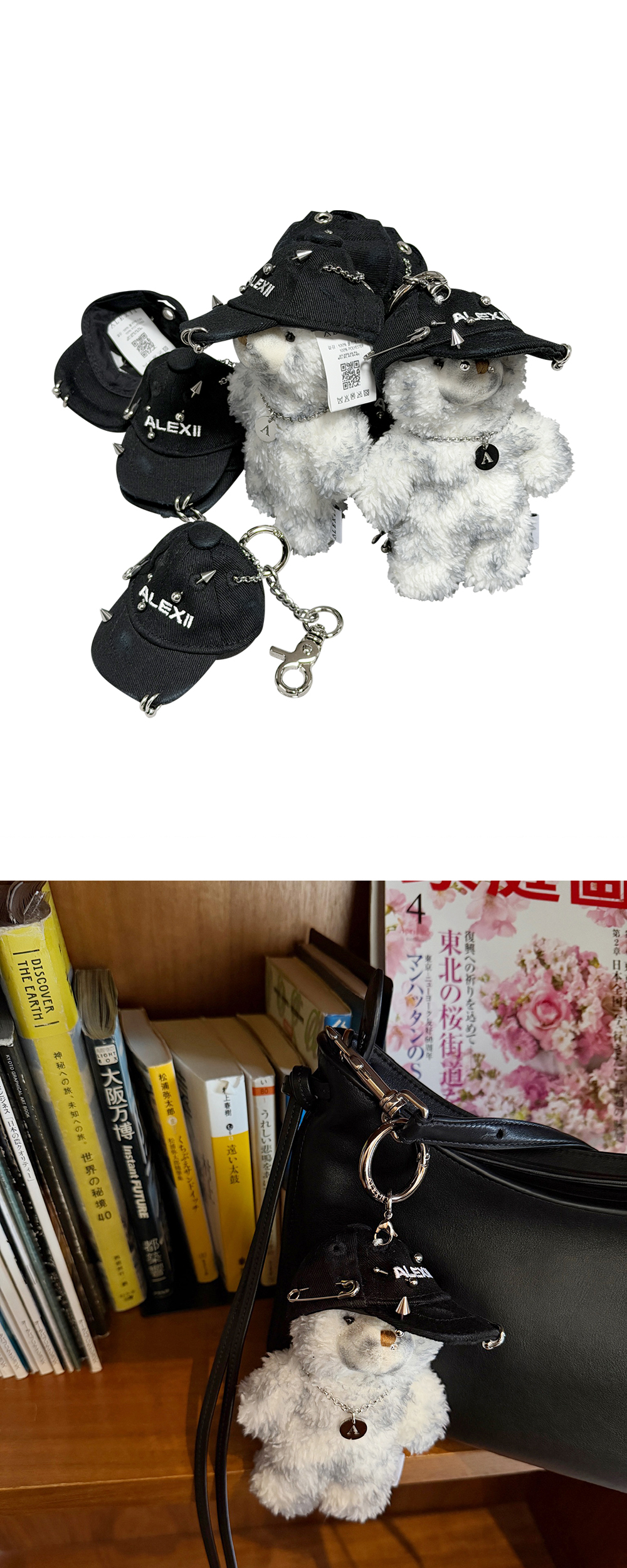 [ALEXII] PIERCING CAP BEAR ALEXII 로고 자수가 놓인 모자에, 녹이 슬지 않는 서지컬(Surgical) 소재 피어싱으로 포인트를 더한 곰돌이 키링입니다. 머리 위에는 모자를 벗길 수 있도록 오픈형 고리를 연결해 두었습니다. 동봉된 고리를 연결하면 모자 부분만 분리해 키링으로 활용하실 수 있습니다. 곰돌이의 털부분은 핸드메이드로 더티가공 작업되었으며 특성상 개체마다 차이가 있을 수 있습니다. - CAP : POLYESTER 100% - PIERCING : SURGICAL STEEL - BEAR : POLYESTER 100% - SILVER-TONE METAL HOOK CLOSURE - MADE IN CHINA (base doll body,cap body) - HAND-CRAFTED & CUSTOMIZED IN KOREA (후가공/커스텀: 베이스가 되는 인형 몸판 제작 외 모든 공정은 한국에서 핸드메이드로 제작됩니다.) # 증정용 카라비너의 색상과 형태는 랜덤으로 발송됩니다.