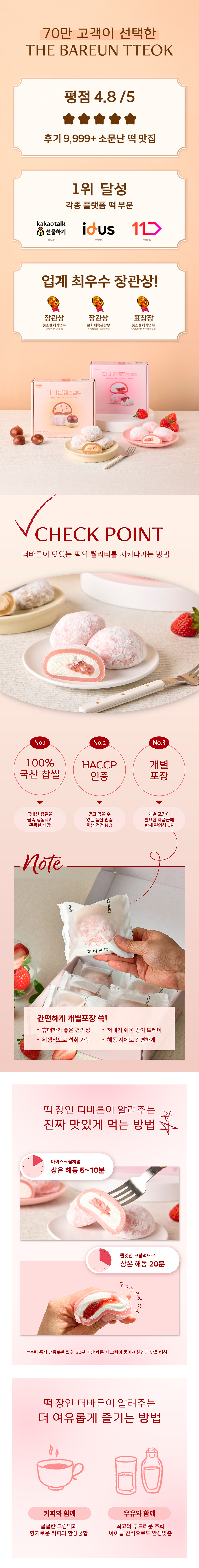 한 입 베어 물면, 부드러운 크림 사이로 딸기의 산뜻함이 스며듭니다. 100% 국산 찹쌀로 만든 쫀득한 떡피와 국산 딸기 퓌레를 더한 부드러운 크림의 조화. 케이크처럼 부드럽지만, 떡 특유의 밀도는 그대로 담았습니다. 달콤함은 가볍게 질감은 깊게 과하지 않은 딸기 향과 입안에서 천천히 녹아드는 크림의 부드러움이 자꾸만 다음 한 입을 생각하게 합니다. 빠르게 얼려 신선함을 지키고 자연 해동만으로 완성되는 디저트 차갑게 먹으면 더 또렷하고, 살짝 부드럽게 두면 더욱 크리미합니다. 오늘의 디저트가 아니라 기억에 남는 한 입으로 다가갑니다.