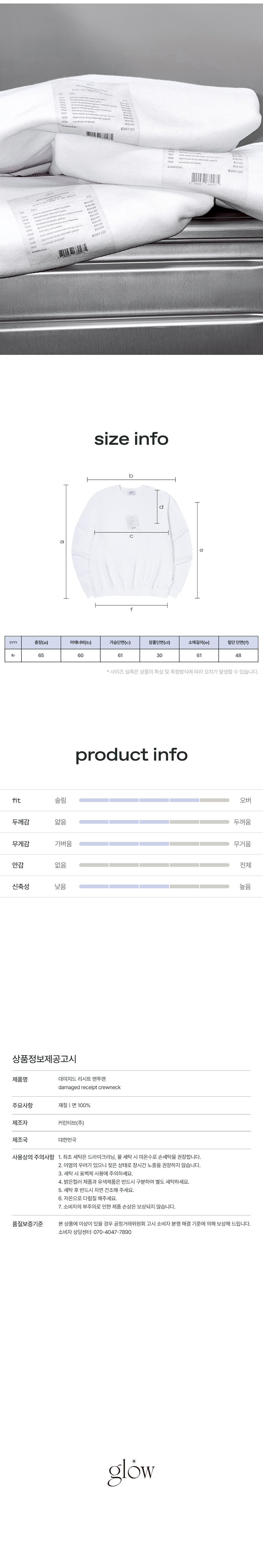 - 글로우 플래그십 스토어 #클리어 영수증 프린팅 포인트 - 코튼 100% 원단으로 무겁지 않고 편안한 착용감 - 자연스러운 실루엣의 스웻셔츠