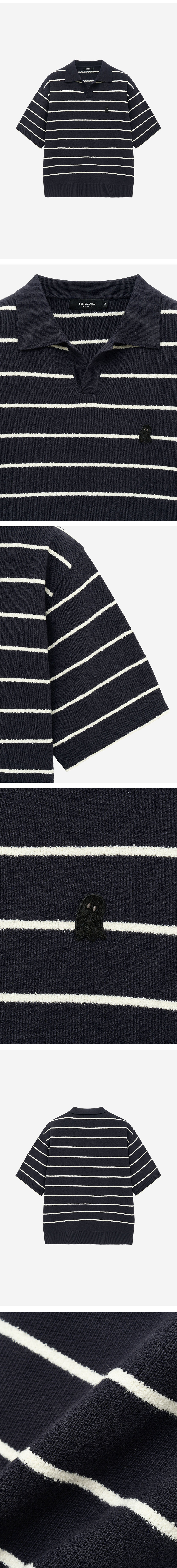 - 셈블런스 부클 스트라이프 오픈카라 반팔 니트 - 헤어감있는 부클사와 플랫한 코튼 원사을 함께 사용 - 스트라이프 부분을 헤어감이 있는 부클사로 편직하여 입체감 표현 - 몸판 RIB 마감으로 자연스럽고 볼륨감 있는 실루엣 연출 - 지오송지오 셈블런스 시그니쳐 고스트 와펜 구성