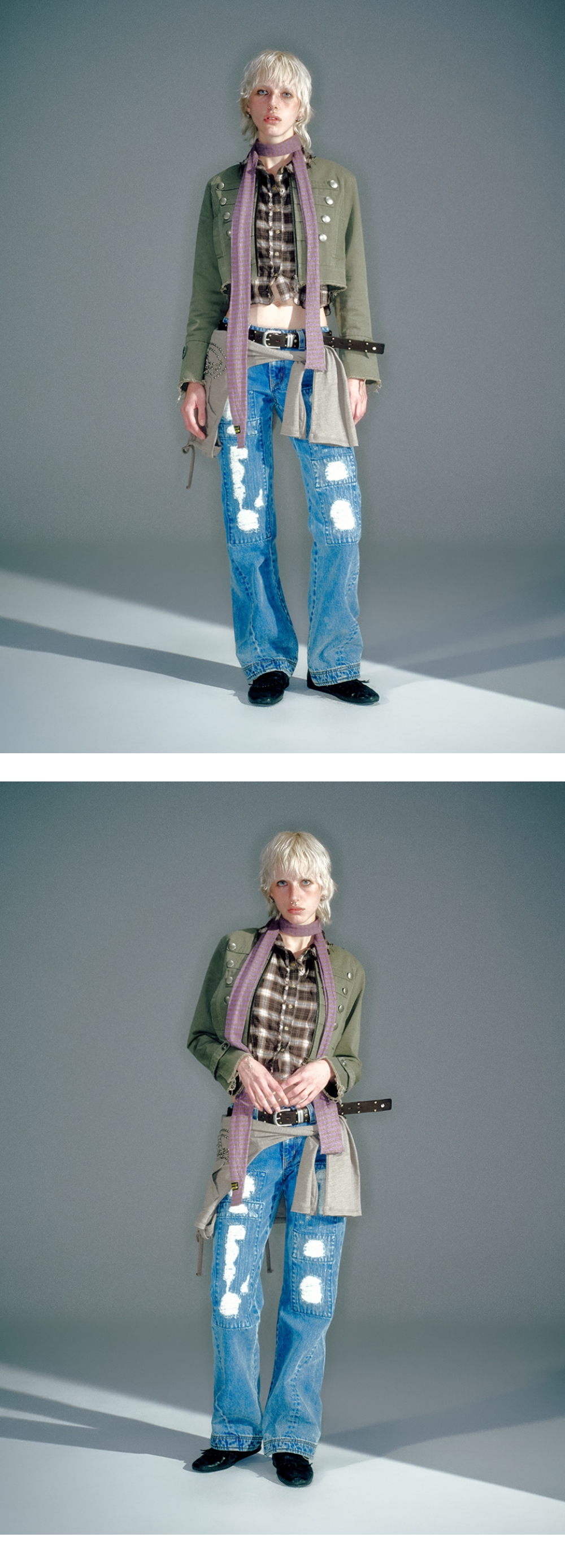 나폴레옹 자켓 디자인을 베이스로 한 빈티지 무드의 자켓 프런트 지퍼와 장식 버튼 디테일로 클래식한 밀리터리 감성 강조 크롭 기장과 숄더·소매 스트랩 디테일로 스타일리시한 완성도 바이오 워싱하여 부드러운 착용감과 빈티지한 마감처리 S/M (CM) Length : 42 / 45 Shoulder : 38 / 40 Bust : 46.5 / 48.5 Sleeve : 63 / 63 Model is 177cm and is wearing a size S COTTON 100%