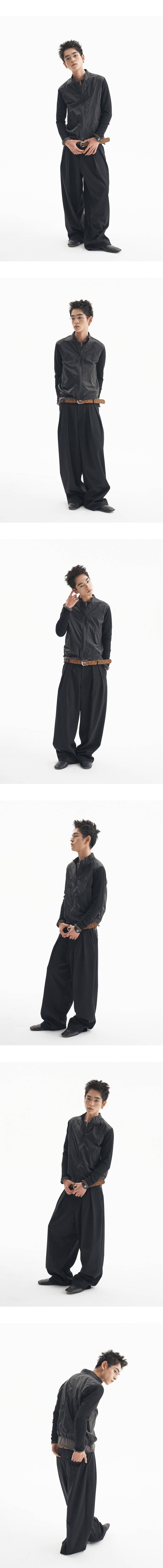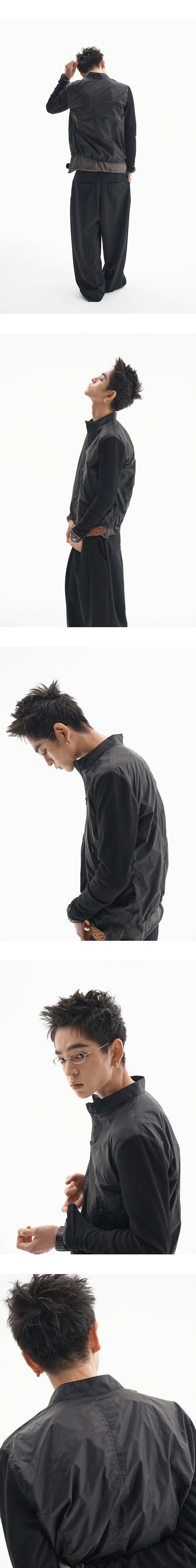 MODEL : 180CM / 61KG WEARING SIZE : 1 나일론과 우븐이 결합된 얇은 소재의 자켓입니다.