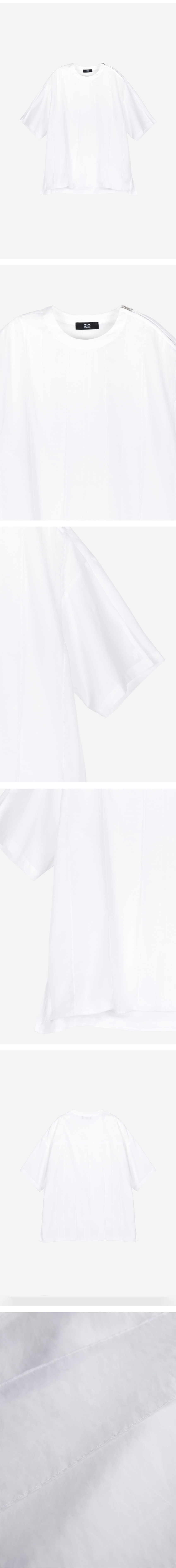 - 레이어드 슬릿 라운드넥 티셔츠 블랙 - 린넨 라이크 폴리 소재와 오간자 소재 믹스 - 여유있는 실루엣 - 라운드넥 사이드 지퍼 트임 디테일 - 오간자 레이어드 슬릿 디자인 - 소매에 ZIO심볼 자수 디자인 - 소매단 슬릿 디테일