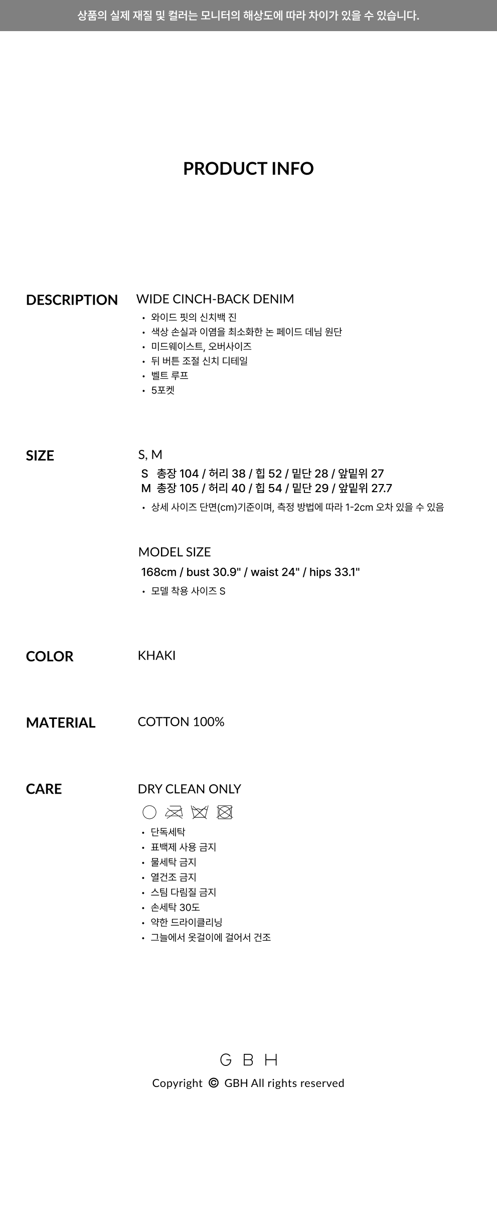 지비에이치 어패럴 와이드 신치백 진 / 카키