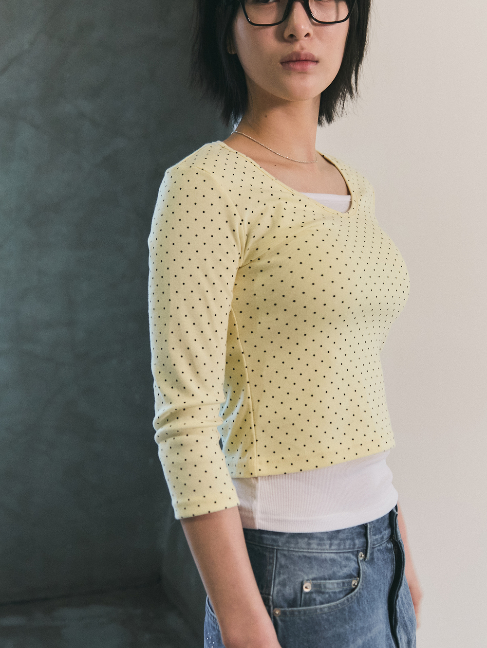블루 선플라워 도트 브이넥 티