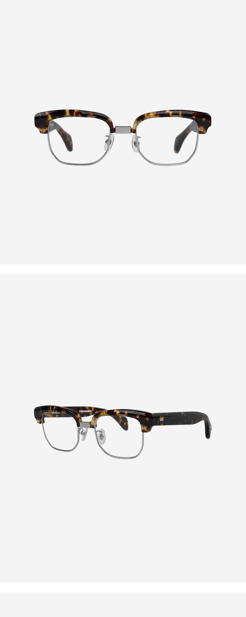 BLACK SIGN 콜라보. 볼드한 브로우 라인과 템플 끝에 블랙사인의 시그니처 디테일 "진실의 눈" 장식이 들어간 하금테 안경.