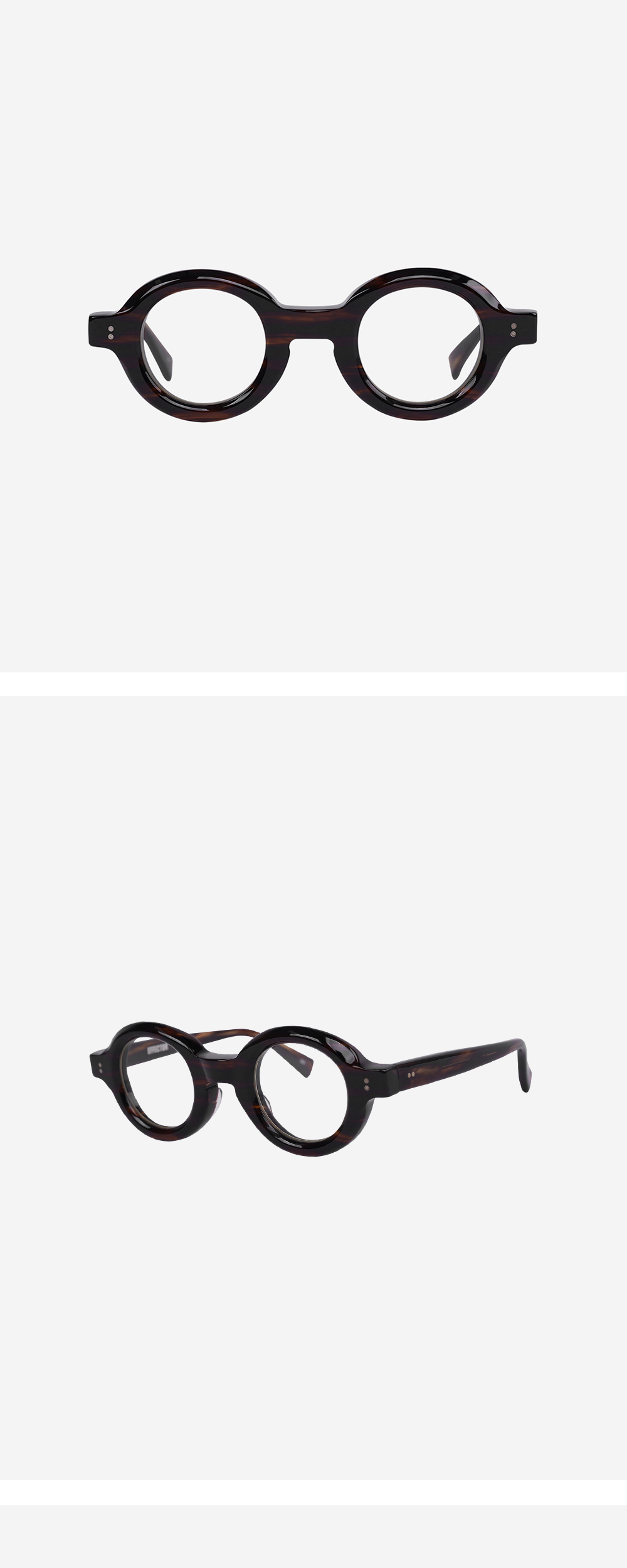 미니멀한 사이즈이지만 8mm두께의 볼드한 림과 대담하게 들어간 커팅이 특징인 원형 프레임의 안경