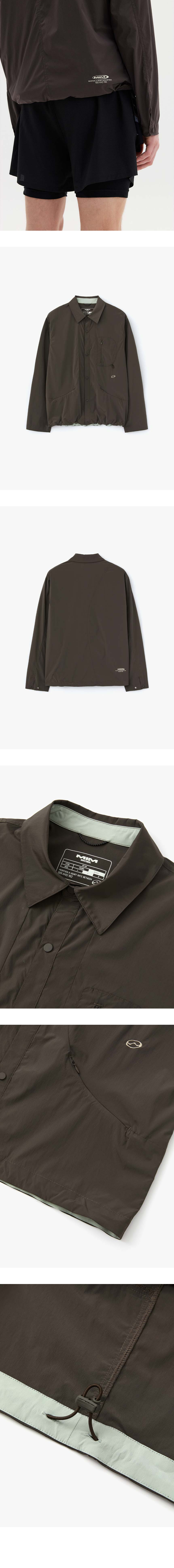 95% Nylon, 5% Spandex Standard silhouette shirt jacket 2-way stretch fabric Curved seam lines with minimal zip pockets 1 : Length 69.5cm / Chest 57.5cm / Shoulder 21.5cm / Sleeve Length 63cm 2 : Length 71cm / Chest 60cm / Shoulder 22.5cm / Sleeve Length 64cm Model : 184cm tall and wearing a size 2 Machine wash, separately Do not dry clean Do not tumble dry Do not use bleach